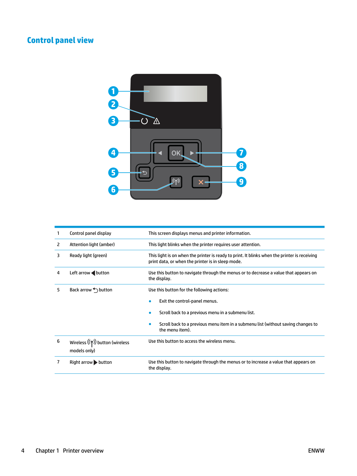 Printer views 3Control panel view 2 3 7 1 8 9 5 6 4 1 Control panel display This screen displays menus and printer information. 2 Attention light (amber) This light blinks when the printer requires user attention. 3 Ready light (green) This light is on when the printer is ready to print. It blinks when the printer is receiving print data, or when the printer is in sleep mode. 4 Left arrow button Use this button to navigate through the menus or to decrease a value that appears on the display. 5 Back arrow button Use this button for the following actions: ● Exit the control-panel menus. ● Scroll back to a previous menu in a submenu list. ● Scroll back to a previous menu item in a submenu list (without saving changes to the menu item). 6 Wireless button (wireless models only) Use this button to access the wireless menu. 7 Right arrow button Use this button to navigate through the menus or to increase a value that appears on the display. 4 Chapter 1 Printer overview