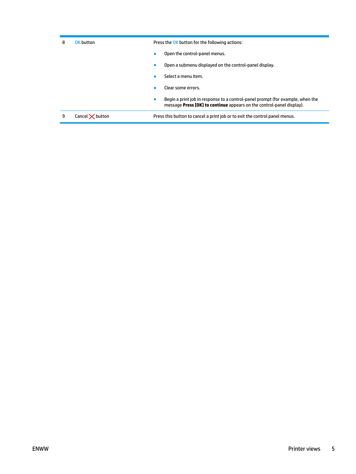 8 OK button Press the OK button for the following actions: ● Open the control-panel menus. ● Open a submenu displayed on the control-panel display. ● Select a menu item. ● Clear some errors. ● Begin a print job in response to a control-panel prompt (for example, when the message Press [OK] to continue appears on the control-panel display). 9 Cancel button Press this button to cancel a print job or to exit the control panel menus.