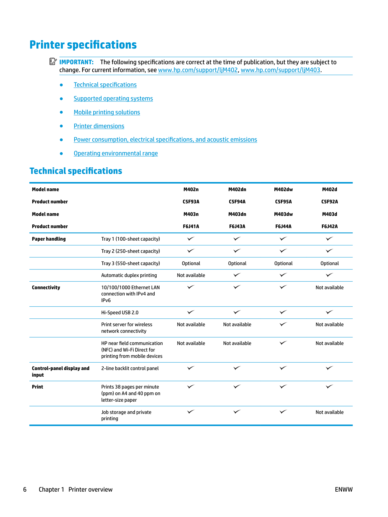 The following specifications are correct at the time of publication, but they are subject to change. For current information, see www.hp.com/support/ljM402, www.hp.com/support/ljM403. ● Technical specifications ● Supported operating systems ● Mobile printing solutions ● Printer dimensions ● Power consumption, electrical specifications, and acoustic emissions ● Operating environmental range Technical specifications Model name Product number Model name Product numberM402n