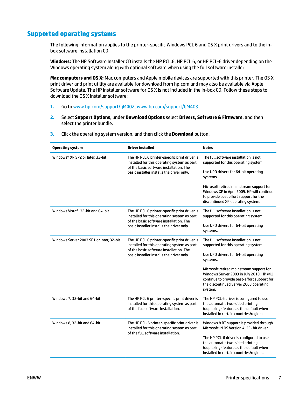 For a current list of supported operating systems, go to www.hp.com/support/ljM402, www.hp.com/ support/ljM403 for HP's all-inclusive help for the printer.Note: