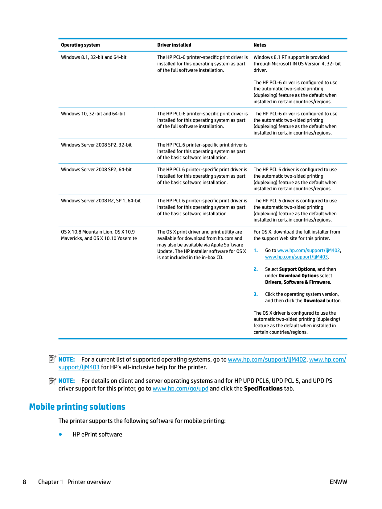 For details on client and server operating systems and for HP UPD PCL6, UPD PCL 5, and UPD PS driver support for this printer, go to www.hp.com/go/upd and click the Specifications tab. Mobile printing solutions The printer supports the following software for mobile printing: ● HP ePrint software 8 Chapter 1 Printer overviewEnww
