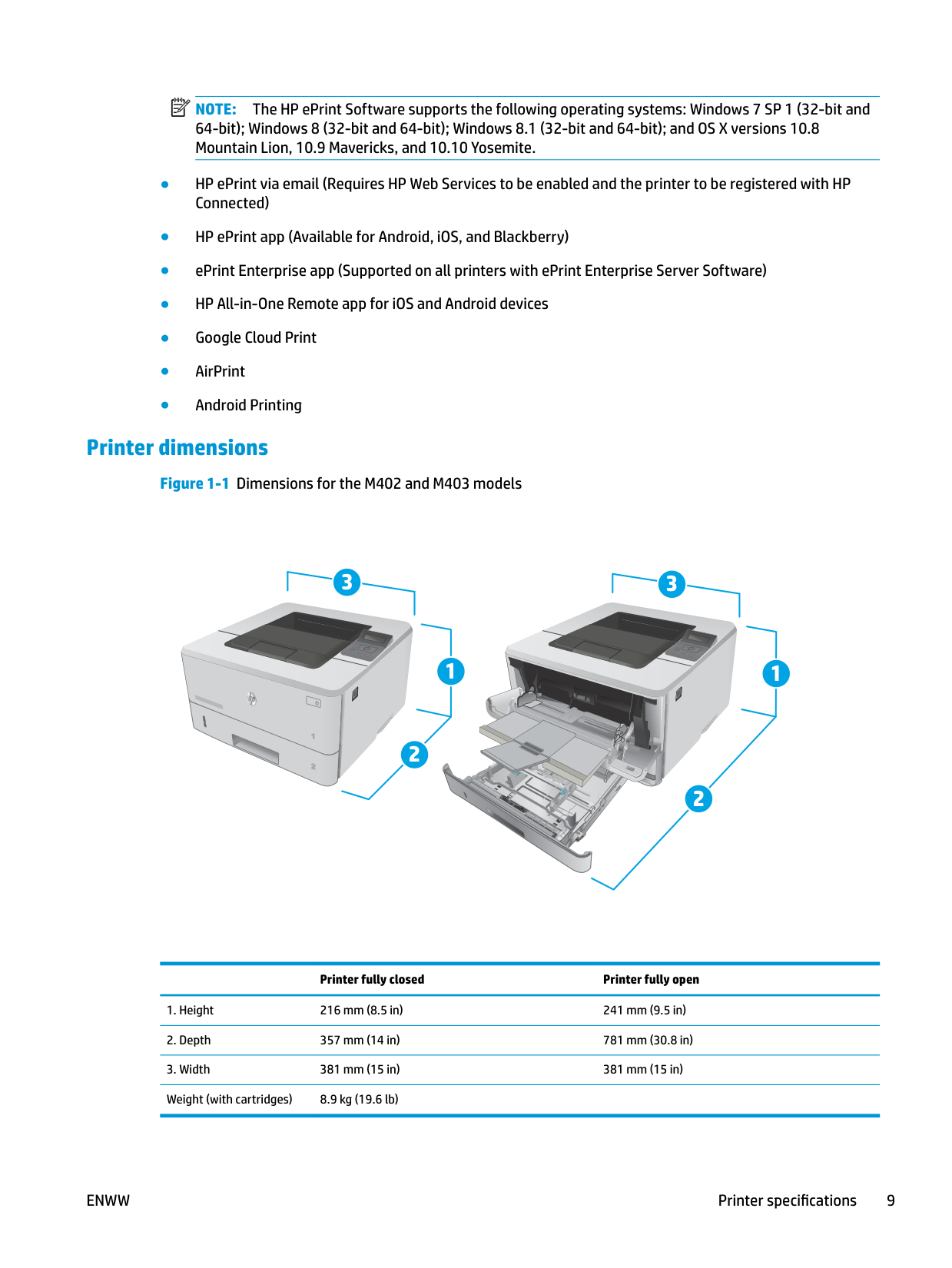 The HP ePrint Software supports the following operating systems: Windows 7 SP 1 (32-bit and 64-bit); Windows 8 (32-bit and 64-bit); Windows 8.1 (32-bit and 64-bit); and OS X versions 10.8 Mountain Lion, 10.9 Mavericks, and 10.10 Yosemite. ● HP ePrint via email (Requires HP Web Services to be enabled and the printer to be registered with HP Connected) ● HP ePrint app (Available for Android, iOS, and Blackberry) ● ePrint Enterprise app (Supported on all printers with ePrint Enterprise Server Software) ● HP All-in-One Remote app for iOS and Android devices ● Google Cloud Print ● AirPrint ● Android Printing Printer dimensions Figure 1-1 Dimensions for the M402 and M403 modelsHewlett-Packard