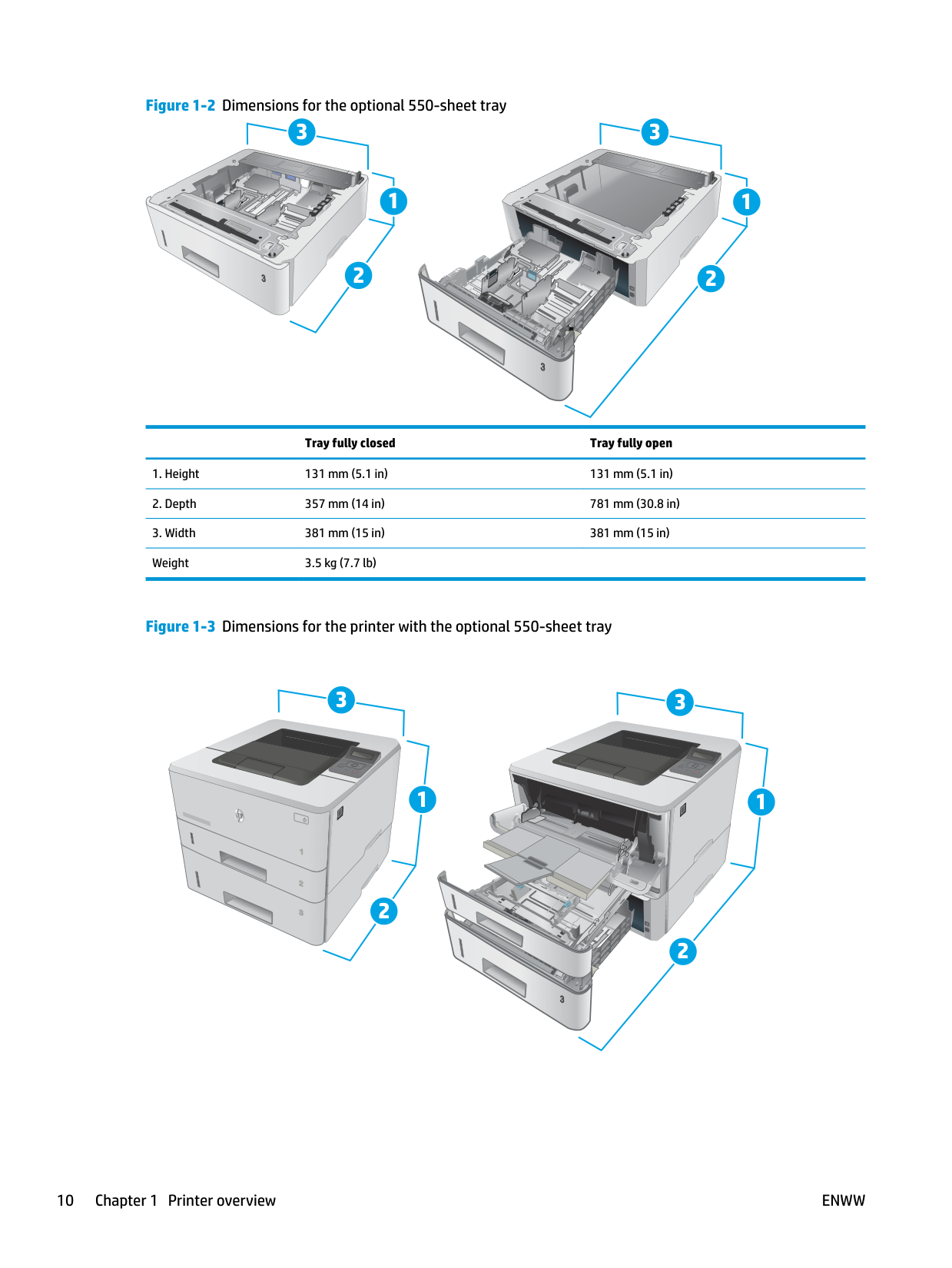 Printer specifications 9Figure 1-2 Dimensions for the optional 550-sheet tray 2 1 3 2 1 3 3 3