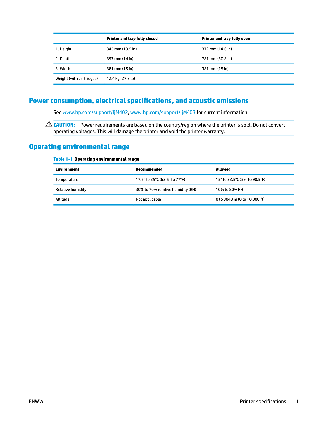 Power requirements are based on the country/region where the printer is sold. Do not convert operating voltages. This will damage the printer and void the printer warranty. Operating environmental range Table 1-1 Operating environmental range Environment Recommended Allowed Temperature 17.5° to 25°C (63.5° to 77°F) 15° to 32.5°C (59° to 90.5°F) Relative humidity 30% to 70% relative humidity (RH) 10% to 80% RH Altitude Not applicable 0 to 3048 m (0 to 10,000 ft)Enww