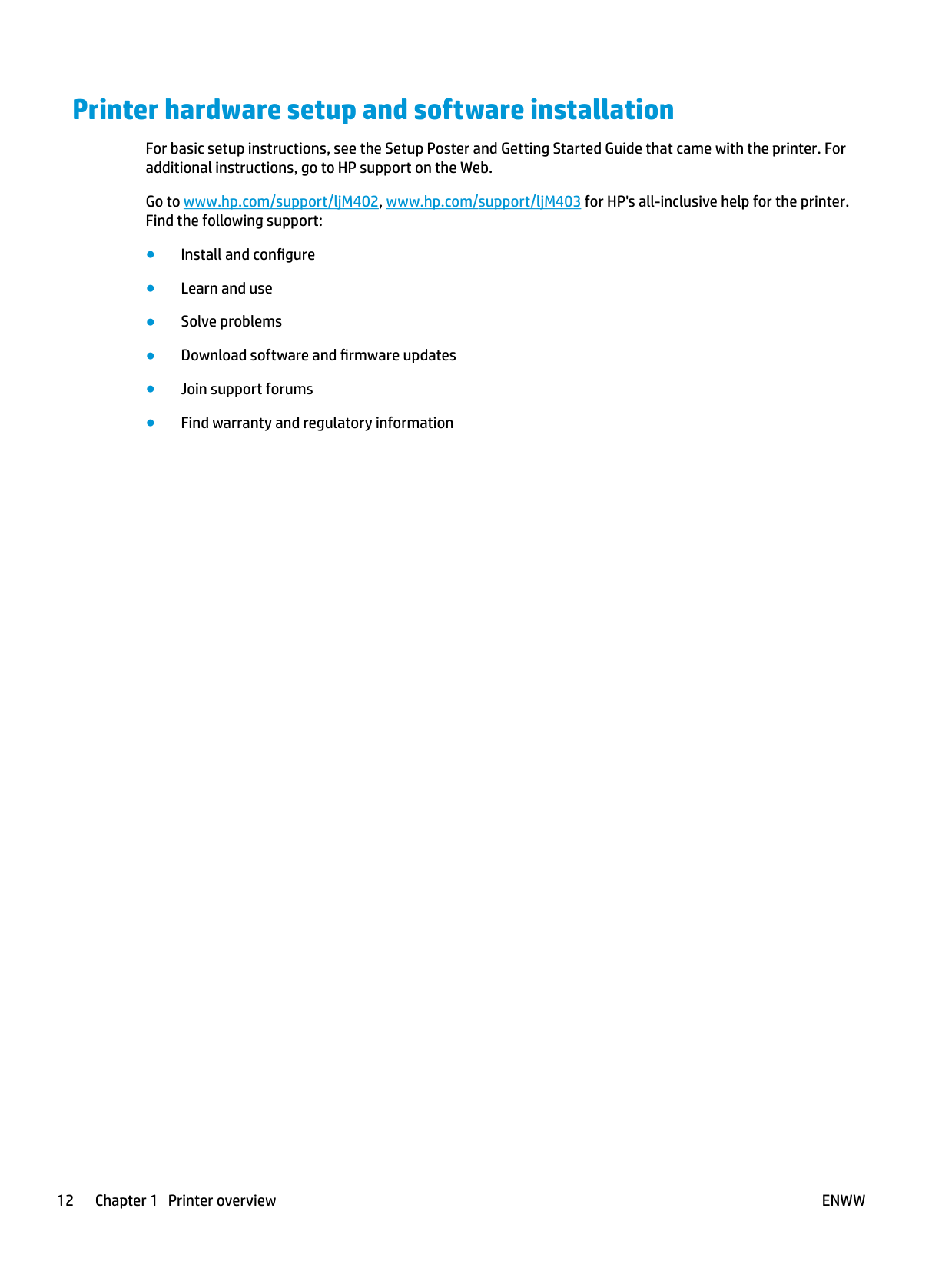 Printer specifications 11Printer hardware setup and software installation For basic setup instructions, see the Setup Poster and Getting Started Guide that came with the printer. For additional instructions, go to HP support on the Web. Go to www.hp.com/support/ljM402, www.hp.com/support/ljM403 for HP's all-inclusive help for the printer. Find the following support: ● Install and configure ● Learn and use ● Solve problems ● Download software and firmware updates ● Join support forums ● Find warranty and regulatory information 12 Chapter 1 Printer overview