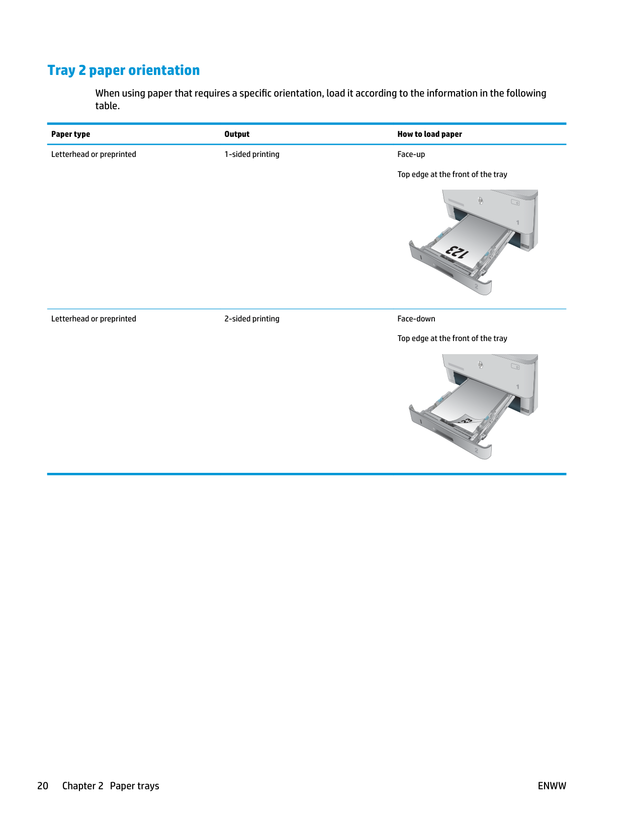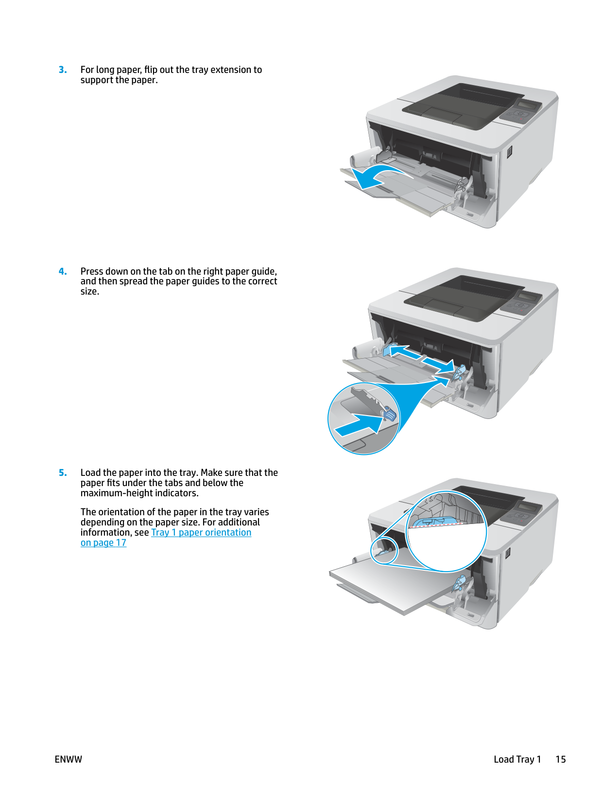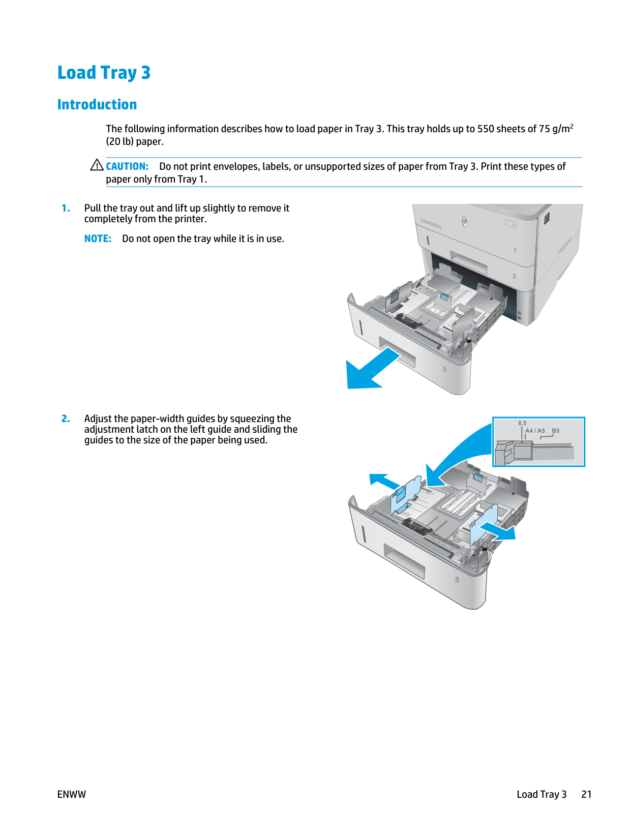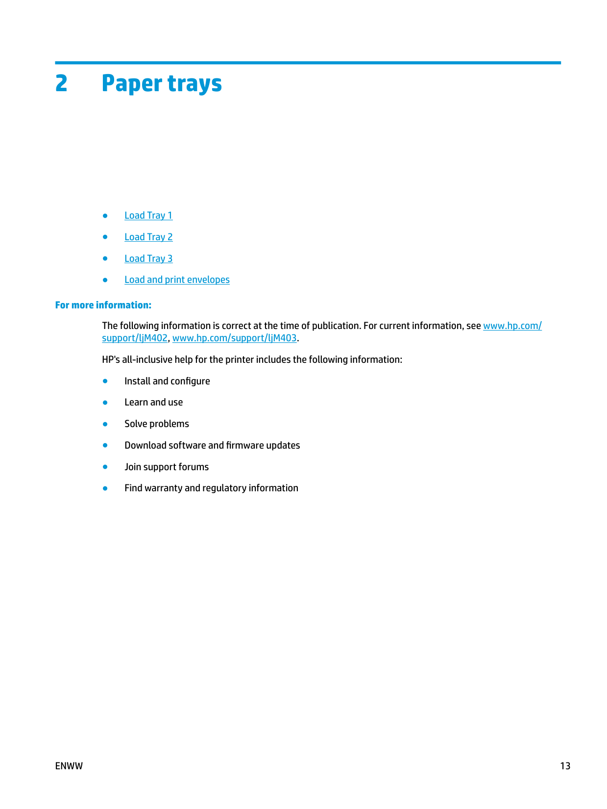 2 Paper trays ● Load Tray 1 ● Load Tray 2 ● Load Tray 3 ● Load and print envelopes For more information: The following information is correct at the time of publication. For current information, see www.hp.com/ support/ljM402, www.hp.com/support/ljM403. HP's all-inclusive help for the printer includes the following information: ● Install and configure ● Learn and use ● Solve problems ● Download software and firmware updates ● Join support forums ● Find warranty and regulatory information