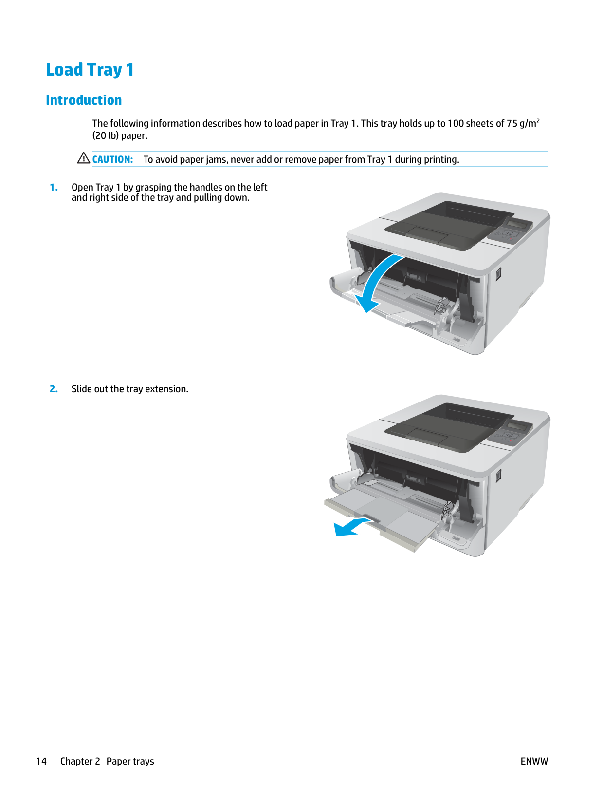 13Load Tray 1 Introduction The following information describes how to load paper in Tray 1. This tray holds up to 100 sheets of 75 g/m2 (20 lb) paper.