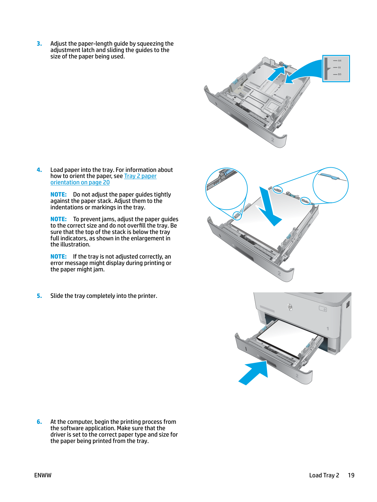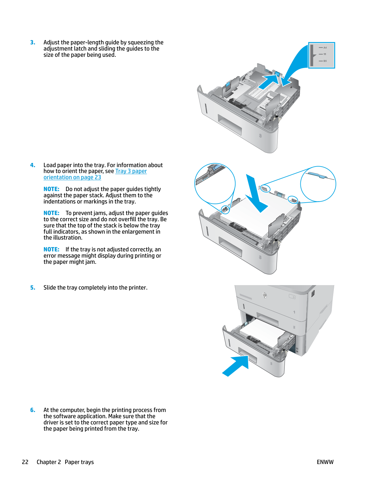 Never add or remove paper from Tray 1 during printing. Additionally, to prevent jams in Trays 2 and 3, adjust the paper guides to the correct size indentations or markings and do not overfill the tray—keep the paper stack below the tray full indicators. (Page 14, 28, 31)