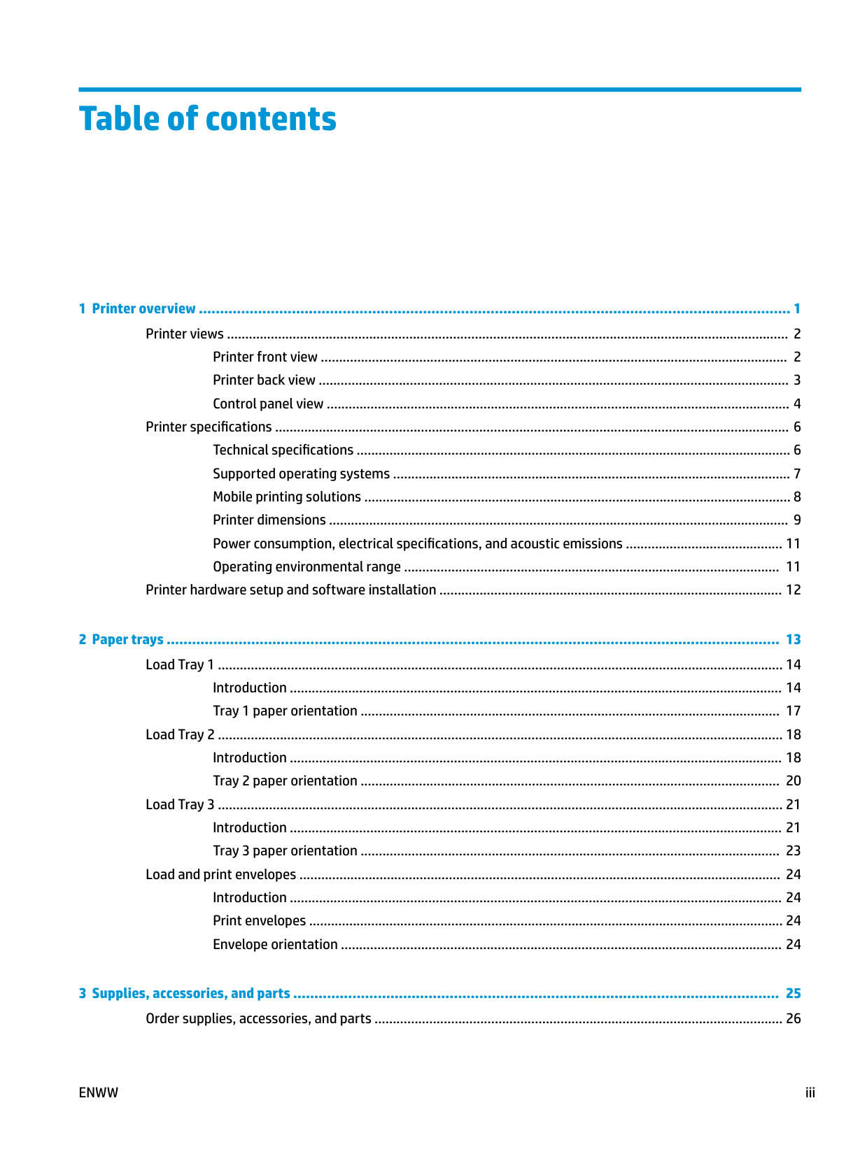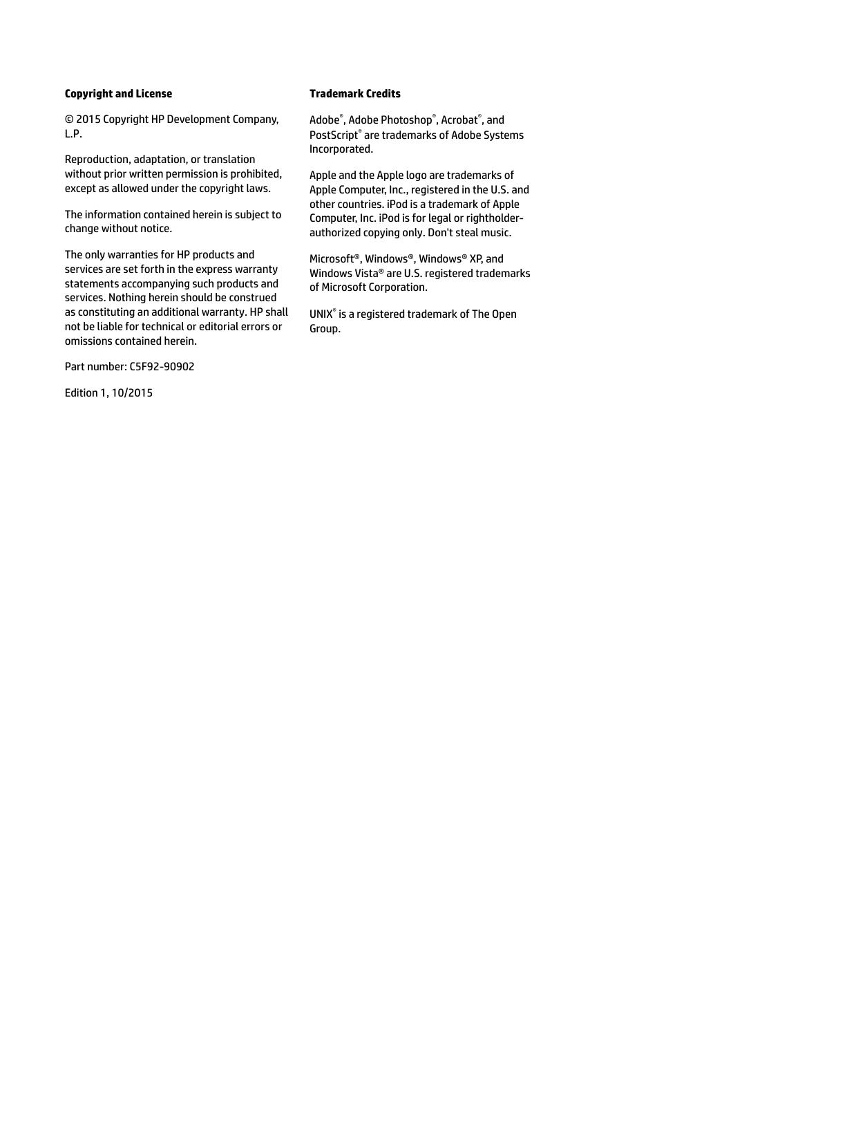 Reproduction, adaptation, or translation without prior written permission is prohibited, except as allowed under the copyright laws. The information contained herein is subject to change without notice. The only warranties for HP products and services are set forth in the express warranty statements accompanying such products and services. Nothing herein should be construed as constituting an additional warranty. HP shall not be liable for technical or editorial errors or omissions contained herein. Part number: C5F92-90902 Edition 1, 10/2015 Trademark Credits Adobe®, Adobe Photoshop®, Acrobat®, and PostScript® are trademarks of Adobe Systems Incorporated. Apple and the Apple logo are trademarks of Apple Computer, Inc., registered in the U.S. and other countries. iPod is a trademark of Apple Computer, Inc. iPod is for legal or rightholder- authorized copying only. Don't steal music. Microsoft®, Windows®, Windows® XP, and Windows Vista® are U.S. registered trademarks of Microsoft Corporation. UNIX® is a registered trademark of The Open Group.Table of contents 1 Printer overview ............................................................................................................................................ 1 Printer views .......................................................................................................................................................... 2 Printer front view ................................................................................................................................ 2 Printer back view ................................................................................................................................. 3 Control panel view ............................................................................................................................... 4 Printer specifications ............................................................................................................................................. 6 Technical specifications ....................................................................................................................... 6 Supported operating systems ............................................................................................................. 7 Mobile printing solutions ..................................................................................................................... 8 Printer dimensions .............................................................................................................................. 9 Power consumption, electrical specifications, and acoustic emissions ........................................... 11 Operating environmental range ....................................................................................................... 11 Printer hardware setup and software installation .............................................................................................. 12 2 Paper trays ................................................................................................................................................. 13 Load Tray 1 ........................................................................................................................................................... 14 Introduction ....................................................................................................................................... 14 Tray 1 paper orientation ................................................................................................................... 17 Load Tray 2 ........................................................................................................................................................... 18 Introduction ....................................................................................................................................... 18 Tray 2 paper orientation ................................................................................................................... 20 Load Tray 3 ........................................................................................................................................................... 21 Introduction ....................................................................................................................................... 21 Tray 3 paper orientation ................................................................................................................... 23 Load and print envelopes .................................................................................................................................... 24 Introduction ....................................................................................................................................... 24 Print envelopes .................................................................................................................................. 24 Envelope orientation ......................................................................................................................... 24 3 Supplies, accessories, and parts ................................................................................................................... 25 Order supplies, accessories, and parts ................................................................................................................ 26