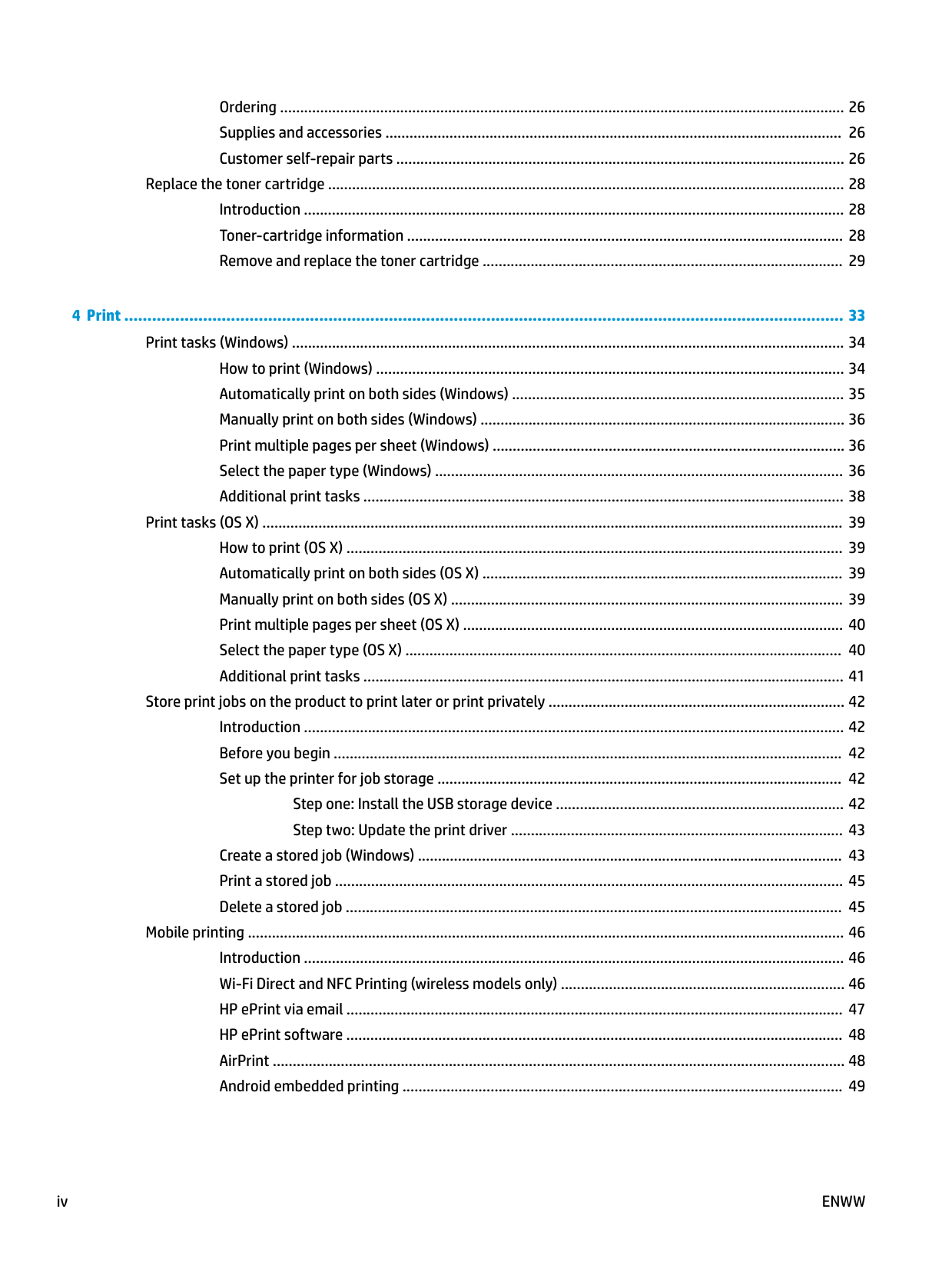 iiiOrdering ............................................................................................................................................. 26 Supplies and accessories .................................................................................................................. 26 Customer self-repair parts ................................................................................................................ 26 Replace the toner cartridge ................................................................................................................................. 28 Introduction ....................................................................................................................................... 28 Toner-cartridge information ............................................................................................................. 28 Remove and replace the toner cartridge .......................................................................................... 29 4 Print ........................................................................................................................................................... 33 Print tasks (Windows) .......................................................................................................................................... 34 How to print (Windows) ..................................................................................................................... 34 Automatically print on both sides (Windows) ................................................................................... 35 Manually print on both sides (Windows) ........................................................................................... 36 Print multiple pages per sheet (Windows) ........................................................................................ 36 Select the paper type (Windows) ...................................................................................................... 36 Additional print tasks ........................................................................................................................ 38 Print tasks (OS X) ................................................................................................................................................. 39 How to print (OS X) ............................................................................................................................ 39 Automatically print on both sides (OS X) .......................................................................................... 39 Manually print on both sides (OS X) .................................................................................................. 39 Print multiple pages per sheet (OS X) ............................................................................................... 40 Select the paper type (OS X) ............................................................................................................. 40 Additional print tasks ........................................................................................................................ 41 Store print jobs on the product to print later or print privately .......................................................................... 42 Introduction ....................................................................................................................................... 42 Before you begin ............................................................................................................................... 42 Set up the printer for job storage ..................................................................................................... 42 Step one: Install the USB storage device ........................................................................ 42 Step two: Update the print driver ................................................................................... 43 Create a stored job (Windows) .......................................................................................................... 43 Print a stored job ............................................................................................................................... 45 Delete a stored job ............................................................................................................................ 45 Mobile printing ..................................................................................................................................................... 46 Introduction ....................................................................................................................................... 46 Wi-Fi Direct and NFC Printing (wireless models only) ....................................................................... 46 HP ePrint via email ............................................................................................................................ 47 HP ePrint software ............................................................................................................................ 48 AirPrint ............................................................................................................................................... 48 Android embedded printing .............................................................................................................. 49 iv