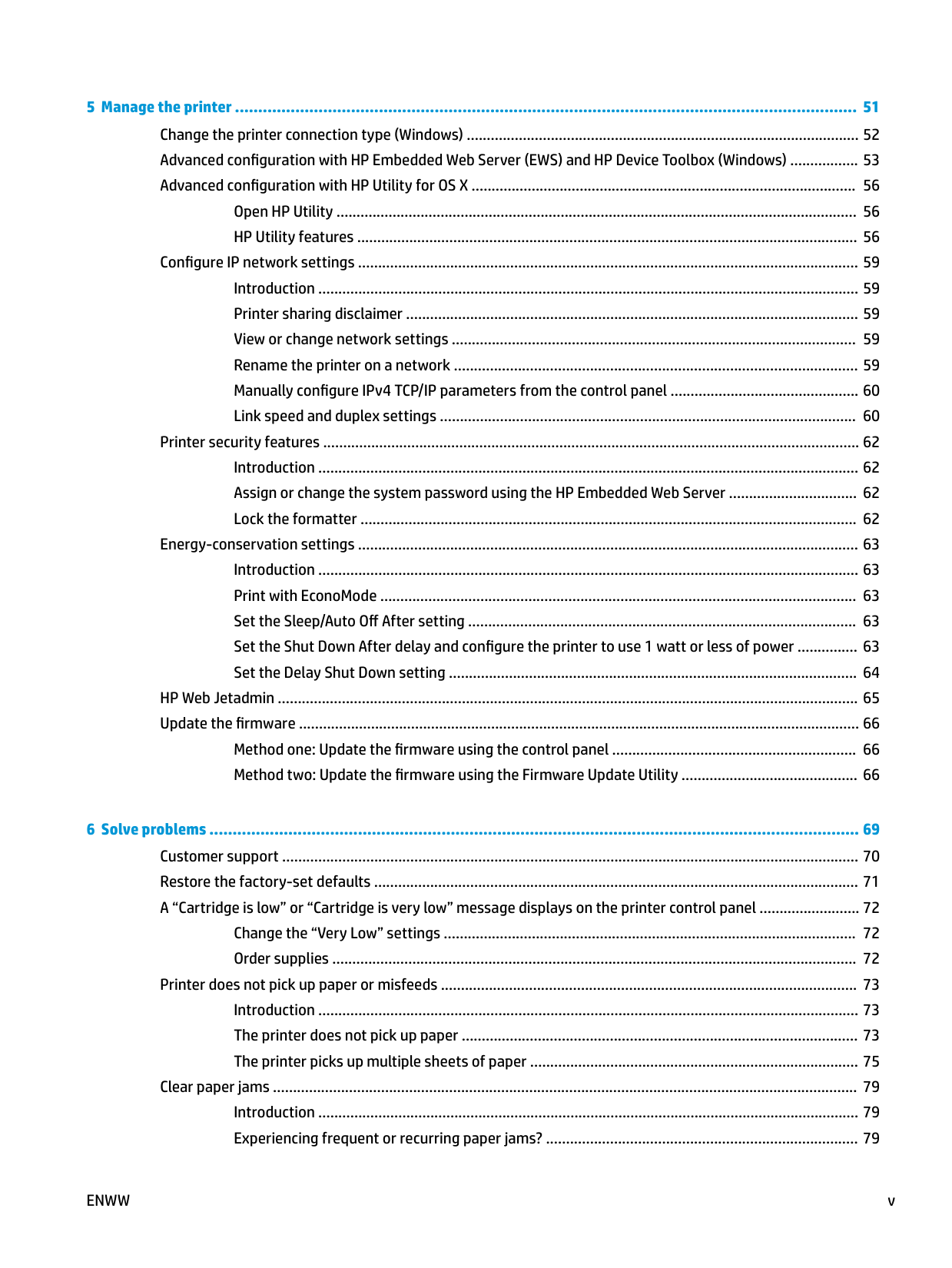 5 Manage the printer ...................................................................................................................................... 51 Change the printer connection type (Windows) .................................................................................................. 52 Advanced configuration with HP Embedded Web Server (EWS) and HP Device Toolbox (Windows) ................. 53 Advanced configuration with HP Utility for OS X ................................................................................................ 56 Open HP Utility .................................................................................................................................. 56 HP Utility features ............................................................................................................................. 56 Configure IP network settings ............................................................................................................................. 59 Introduction ....................................................................................................................................... 59 Printer sharing disclaimer ................................................................................................................. 59 View or change network settings ..................................................................................................... 59 Rename the printer on a network ..................................................................................................... 59 Manually configure IPv4 TCP/IP parameters from the control panel ............................................... 60 Link speed and duplex settings ........................................................................................................ 60 Printer security features ...................................................................................................................................... 62 Introduction ....................................................................................................................................... 62 Assign or change the system password using the HP Embedded Web Server ................................ 62 Lock the formatter ............................................................................................................................ 62 Energy-conservation settings ............................................................................................................................. 63 Introduction ....................................................................................................................................... 63 Print with EconoMode ....................................................................................................................... 63 Set the Sleep/Auto Off After setting ................................................................................................. 63 Set the Shut Down After delay and configure the printer to use 1 watt or less of power ............... 63 Set the Delay Shut Down setting ...................................................................................................... 64 HP Web Jetadmin ................................................................................................................................................. 65 Update the firmware ............................................................................................................................................ 66 Method one: Update the firmware using the control panel ............................................................. 66 Method two: Update the firmware using the Firmware Update Utility ............................................ 66 6 Solve problems ............................................................................................................................................ 69 Customer support ................................................................................................................................................ 70 Restore the factory-set defaults ......................................................................................................................... 71 A “Cartridge is low” or “Cartridge is very low” message displays on the printer control panel ......................... 72 Change the “Very Low” settings ....................................................................................................... 72 Order supplies ................................................................................................................................... 72 Printer does not pick up paper or misfeeds ........................................................................................................ 73 Introduction ....................................................................................................................................... 73 The printer does not pick up paper ................................................................................................... 73 The printer picks up multiple sheets of paper .................................................................................. 75 Clear paper jams .................................................................................................................................................. 79 Introduction ....................................................................................................................................... 79 Experiencing frequent or recurring paper jams? .............................................................................. 79