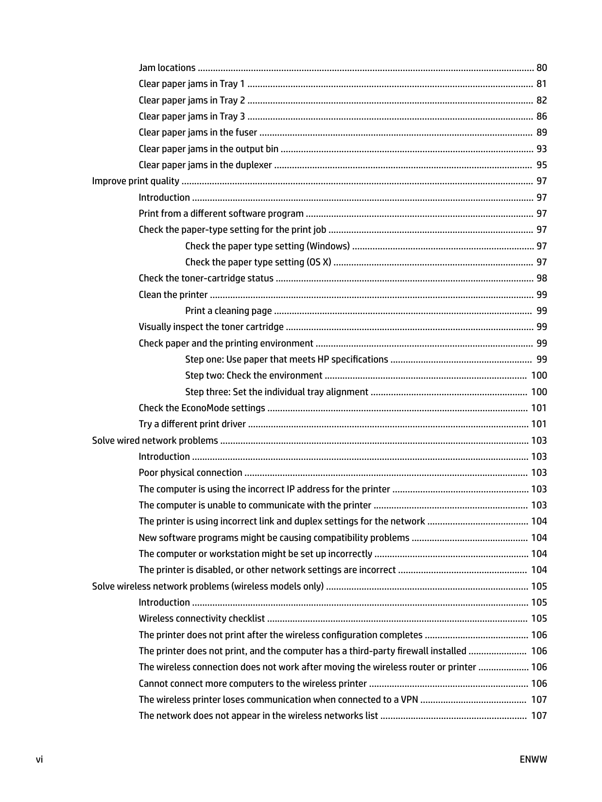 vJam locations ..................................................................................................................................... 80 Clear paper jams in Tray 1 ................................................................................................................. 81 Clear paper jams in Tray 2 ................................................................................................................. 82 Clear paper jams in Tray 3 ................................................................................................................. 86 Clear paper jams in the fuser ............................................................................................................ 89 Clear paper jams in the output bin .................................................................................................... 93 Clear paper jams in the duplexer ...................................................................................................... 95 Improve print quality ........................................................................................................................................... 97 Introduction ....................................................................................................................................... 97 Print from a different software program .......................................................................................... 97 Check the paper-type setting for the print job ................................................................................. 97 Check the paper type setting (Windows) ........................................................................ 97 Check the paper type setting (OS X) ............................................................................... 97 Check the toner-cartridge status ...................................................................................................... 98 Clean the printer ................................................................................................................................ 99 Print a cleaning page ...................................................................................................... 99 Visually inspect the toner cartridge .................................................................................................. 99 Check paper and the printing environment ...................................................................................... 99 Step one: Use paper that meets HP specifications ........................................................ 99 Step two: Check the environment ................................................................................ 100 Step three: Set the individual tray alignment .............................................................. 100 Check the EconoMode settings ....................................................................................................... 101 Try a different print driver ............................................................................................................... 101 Solve wired network problems .......................................................................................................................... 103 Introduction ..................................................................................................................................... 103 Poor physical connection ................................................................................................................ 103 The computer is using the incorrect IP address for the printer ...................................................... 103 The computer is unable to communicate with the printer ............................................................. 103 The printer is using incorrect link and duplex settings for the network ........................................ 104 New software programs might be causing compatibility problems .............................................. 104 The computer or workstation might be set up incorrectly ............................................................. 104 The printer is disabled, or other network settings are incorrect ................................................... 104 Solve wireless network problems (wireless models only) ................................................................................ 105 Introduction ..................................................................................................................................... 105 Wireless connectivity checklist ....................................................................................................... 105 The printer does not print after the wireless configuration completes ......................................... 106 The printer does not print, and the computer has a third-party firewall installed ....................... 106 The wireless connection does not work after moving the wireless router or printer .................... 106 Cannot connect more computers to the wireless printer ............................................................... 106 The wireless printer loses communication when connected to a VPN .......................................... 107 The network does not appear in the wireless networks list .......................................................... 107 vi