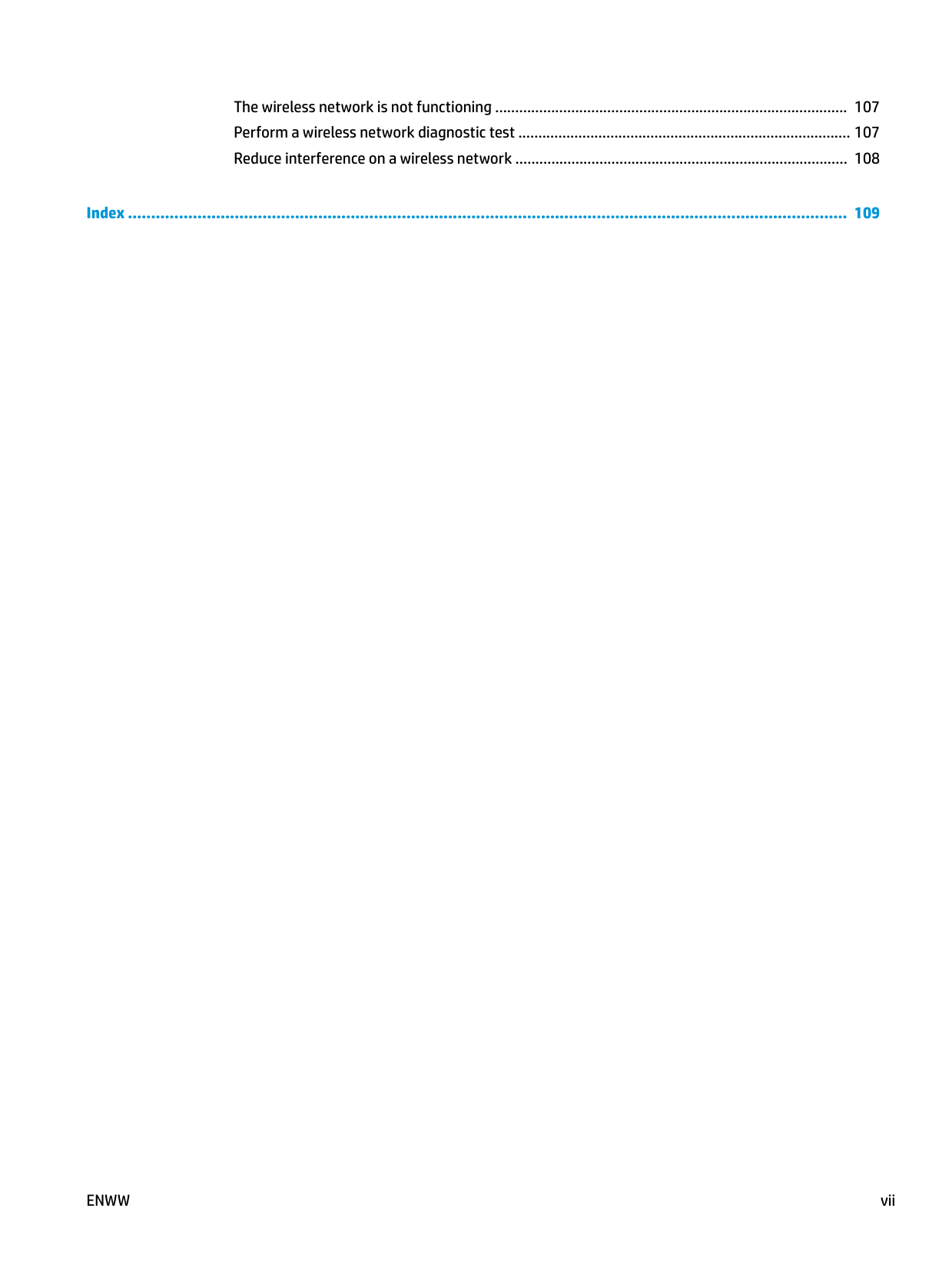 The wireless network is not functioning ........................................................................................ 107 Perform a wireless network diagnostic test ................................................................................... 107 Reduce interference on a wireless network ................................................................................... 108 Index ........................................................................................................................................................... 109