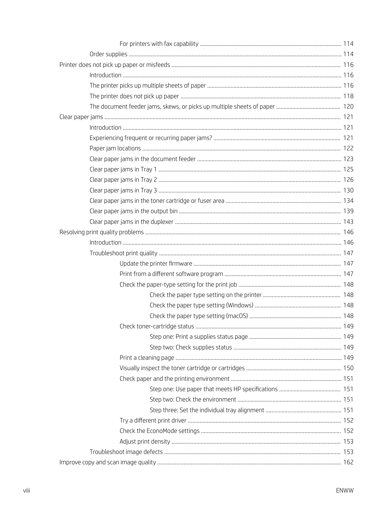 viiFor printers with fax capability ................................................................................................. 114 Order supplies .................................................................................................................................................. 114 Printer does not pick up paper or misfeeds .................................................................................................................... 116 Introduction ...................................................................................................................................................... 116 The printer picks up multiple sheets of paper ............................................................................................ 116 The printer does not pick up paper .............................................................................................................. 118 The document feeder jams, skews, or picks up multiple sheets of paper ............................................ 120 Clear paper jams .................................................................................................................................................................. 121 Introduction ...................................................................................................................................................... 121 Experiencing frequent or recurring paper jams? ....................................................................................... 121 Paper jam locations ........................................................................................................................................ 122 Clear paper jams in the document feeder ................................................................................................... 123 Clear paper jams in Tray 1 ............................................................................................................................. 125 Clear paper jams in Tray 2 ............................................................................................................................. 126 Clear paper jams in Tray 3 ............................................................................................................................. 130 Clear paper jams in the toner cartridge or fuser area ............................................................................... 134 Clear paper jams in the output bin ............................................................................................................... 139 Clear paper jams in the duplexer .................................................................................................................. 143 Resolving print quality problems ...................................................................................................................................... 146 Introduction ...................................................................................................................................................... 146 Troubleshoot print quality ............................................................................................................................. 147 Update the printer firmware ..................................................................................................... 147 Print from a different software program ................................................................................ 147 Check the paper-type setting for the print job ...................................................................... 148 Check the paper type setting on the printer ..................................................... 148 Check the paper type setting (Windows) ........................................................... 148 Check the paper type setting (macOS) ............................................................... 148 Check toner-cartridge status .................................................................................................... 149 Step one: Print a supplies status page ............................................................... 149 Step two: Check supplies status .......................................................................... 149 Print a cleaning page .................................................................................................................. 149 Visually inspect the toner cartridge or cartridges ................................................................. 150 Check paper and the printing environment ............................................................................ 151 Step one: Use paper that meets HP specifications .......................................... 151 Step two: Check the environment ....................................................................... 151 Step three: Set the individual tray alignment .................................................... 151 Try a different print driver ......................................................................................................... 152 Check the EconoMode settings ................................................................................................ 152 Adjust print density .................................................................................................................... 153 Troubleshoot image defects ......................................................................................................................... 153 Improve copy and scan image quality .............................................................................................................................. 162 viii