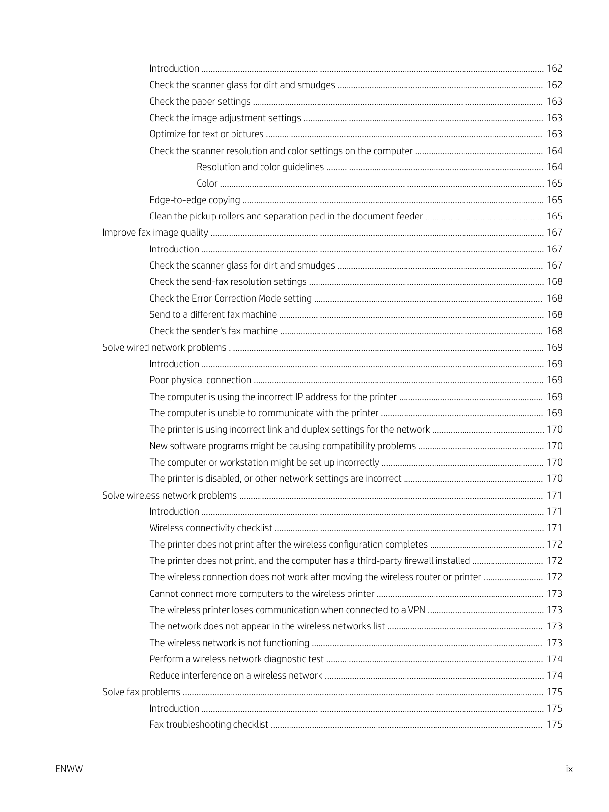 Introduction ...................................................................................................................................................... 162 Check the scanner glass for dirt and smudges .......................................................................................... 162 Check the paper settings ............................................................................................................................... 163 Check the image adjustment settings ......................................................................................................... 163 Optimize for text or pictures ......................................................................................................................... 163 Check the scanner resolution and color settings on the computer ........................................................ 164 Resolution and color guidelines ............................................................................................... 164 Color .............................................................................................................................................. 165 Edge-to-edge copying .................................................................................................................................... 165 Clean the pickup rollers and separation pad in the document feeder .................................................... 165 Improve fax image quality .................................................................................................................................................. 167 Introduction ...................................................................................................................................................... 167 Check the scanner glass for dirt and smudges .......................................................................................... 167 Check the send-fax resolution settings ....................................................................................................... 168 Check the Error Correction Mode setting .................................................................................................... 168 Send to a different fax machine .................................................................................................................... 168 Check the sender's fax machine ................................................................................................................... 168 Solve wired network problems .......................................................................................................................................... 169 Introduction ...................................................................................................................................................... 169 Poor physical connection ............................................................................................................................... 169 The computer is using the incorrect IP address for the printer ............................................................... 169 The computer is unable to communicate with the printer ....................................................................... 169 The printer is using incorrect link and duplex settings for the network ................................................. 170 New software programs might be causing compatibility problems ....................................................... 170 The computer or workstation might be set up incorrectly ....................................................................... 170 The printer is disabled, or other network settings are incorrect ............................................................. 170 Solve wireless network problems ..................................................................................................................................... 171 Introduction ...................................................................................................................................................... 171 Wireless connectivity checklist ...................................................................................................................... 171 The printer does not print after the wireless configuration completes .................................................. 172 The printer does not print, and the computer has a third-party firewall installed ............................... 172 The wireless connection does not work after moving the wireless router or printer .......................... 172 Cannot connect more computers to the wireless printer ......................................................................... 173 The wireless printer loses communication when connected to a VPN ................................................... 173 The network does not appear in the wireless networks list .................................................................... 173 The wireless network is not functioning ..................................................................................................... 173 Perform a wireless network diagnostic test ............................................................................................... 174 Reduce interference on a wireless network ................................................................................................ 174 Solve fax problems .............................................................................................................................................................. 175 Introduction ...................................................................................................................................................... 175 Fax troubleshooting checklist ....................................................................................................................... 175