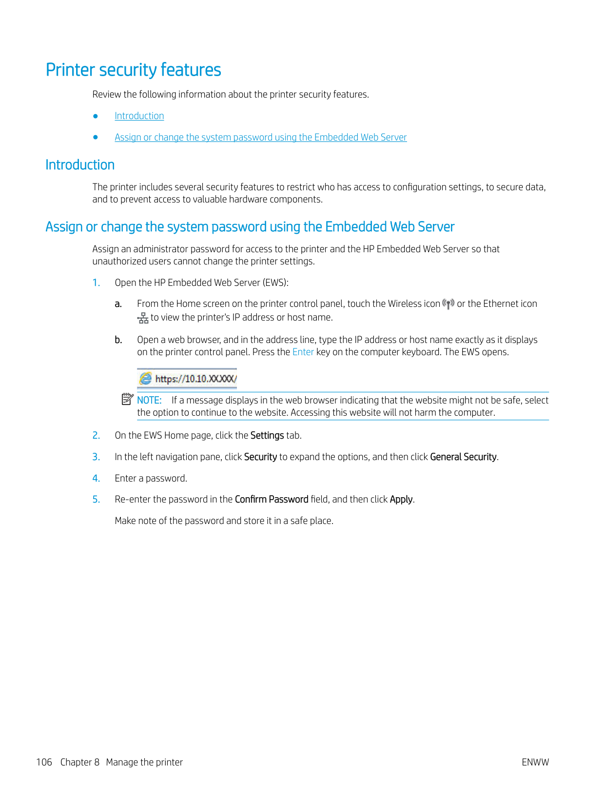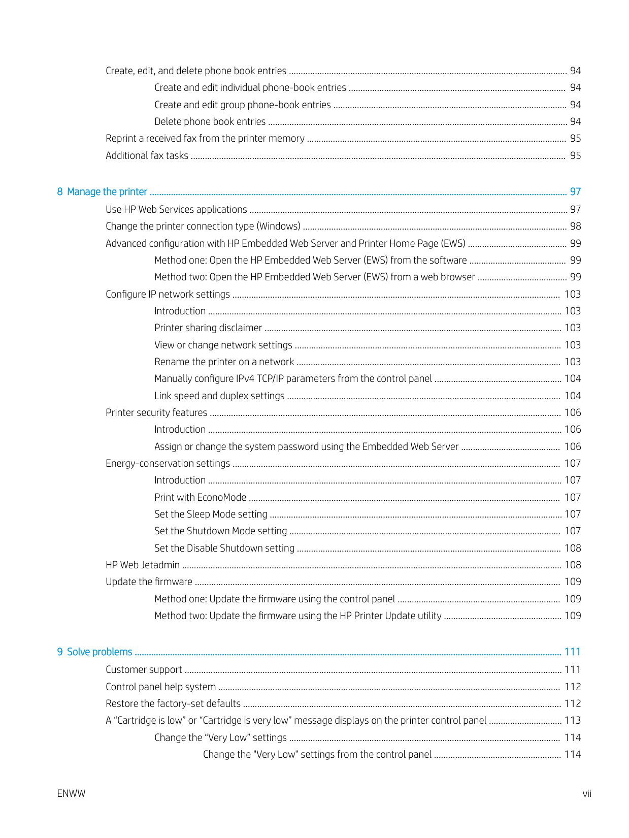 Create, edit, and delete phone book entries ...................................................................................................................... 94 Create and edit individual phone-book entries ............................................................................................ 94 Create and edit group phone-book entries ................................................................................................... 94 Delete phone book entries ............................................................................................................................... 94 Reprint a received fax from the printer memory .............................................................................................................. 95 Additional fax tasks ............................................................................................................................................................... 95 8 Manage the printer ................................................................................................................................................................................. 97 Use HP Web Services applications ....................................................................................................................................... 97 Change the printer connection type (Windows) ................................................................................................................ 98 Advanced configuration with HP Embedded Web Server and Printer Home Page (EWS) .......................................... 99 Method one: Open the HP Embedded Web Server (EWS) from the software ......................................... 99 Method two: Open the HP Embedded Web Server (EWS) from a web browser ...................................... 99 Configure IP network settings ........................................................................................................................................... 103 Introduction ...................................................................................................................................................... 103 Printer sharing disclaimer .............................................................................................................................. 103 View or change network settings ................................................................................................................. 103 Rename the printer on a network ................................................................................................................ 103 Manually configure IPv4 TCP/IP parameters from the control panel ...................................................... 104 Link speed and duplex settings .................................................................................................................... 104 Printer security features ..................................................................................................................................................... 106 Introduction ...................................................................................................................................................... 106 Assign or change the system password using the Embedded Web Server .......................................... 106 Energy-conservation settings ........................................................................................................................................... 107 Introduction ...................................................................................................................................................... 107 Print with EconoMode .................................................................................................................................... 107 Set the Sleep Mode setting ............................................................................................................................ 107 Set the Shutdown Mode setting ................................................................................................................... 107 Set the Disable Shutdown setting ................................................................................................................ 108 HP Web Jetadmin ................................................................................................................................................................. 108 Update the firmware ........................................................................................................................................................... 109 Method one: Update the firmware using the control panel ..................................................................... 109 Method two: Update the firmware using the HP Printer Update utility .................................................. 109 9 Solve problems ..................................................................................................................................................................................... 111 Customer support ................................................................................................................................................................ 111 Control panel help system ................................................................................................................................................. 112 Restore the factory-set defaults ....................................................................................................................................... 112 A “Cartridge is low” or “Cartridge is very low” message displays on the printer control panel ............................... 113 Change the “Very Low” settings ................................................................................................................... 114 Change the "Very Low" settin