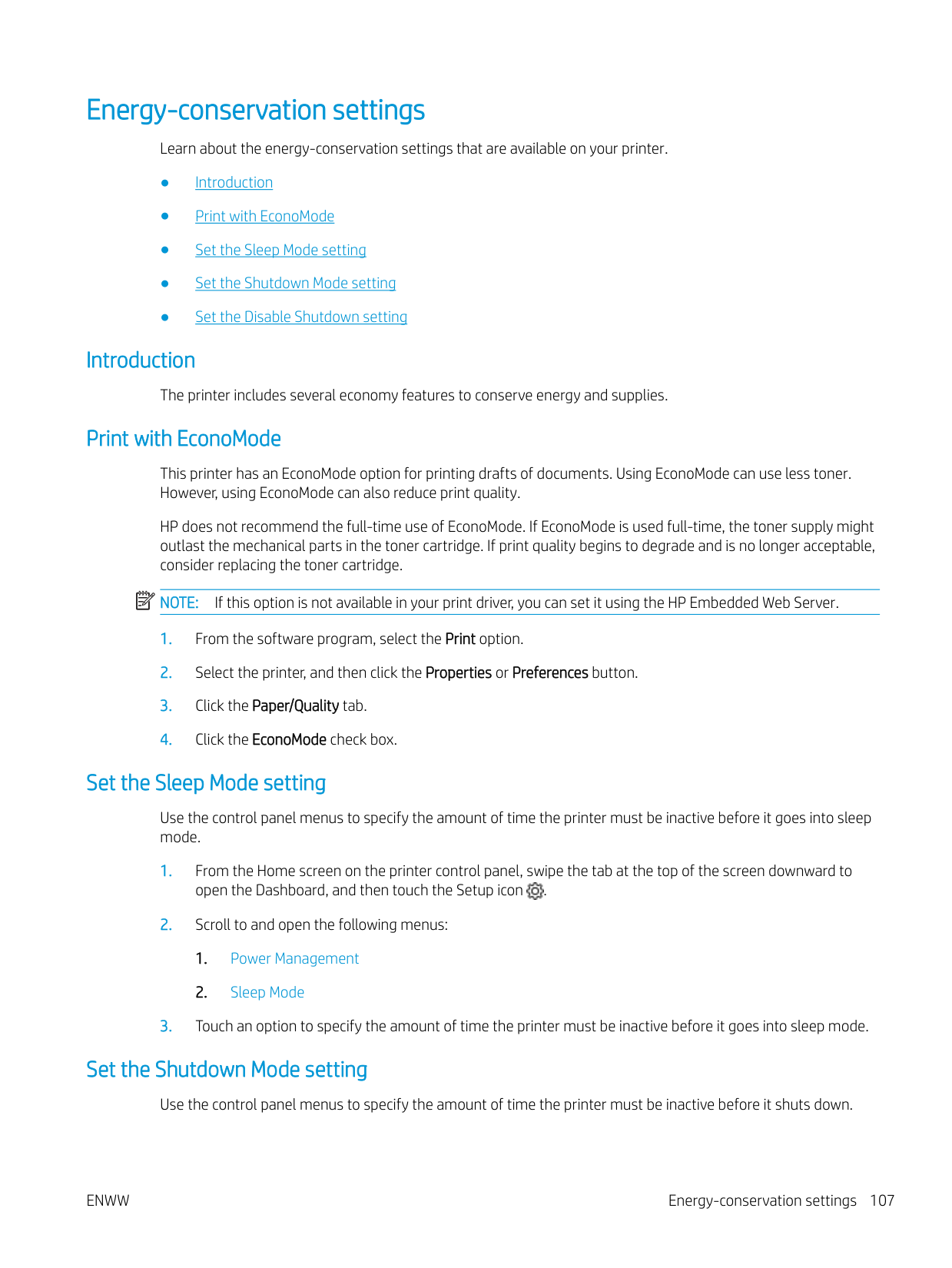 ● Recommended for printing in all Windows environments ● Provides the overall best speed, print quality, and printer feature support for most users ● Developed to align with Windows Graphic Device Interface (GDI) for best speed in Windows environments ● Might not be fully compatible with third-party and custom software programs that are based on PCL 5 Check the EconoMode settings HP does not recommend the full-time use of EconoMode. If EconoMode is used full-time, the toner supply might outlast the mechanical parts in the toner cartridge. If print quality begins to degrade and is no longer acceptable, consider replacing the toner cartridge.Note: