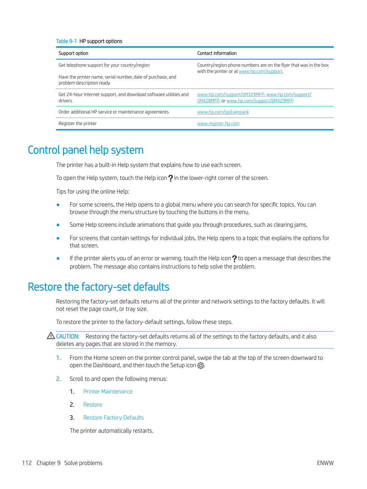 The Low Threshold option allows you to define the level of ink that is considered very low. For printers with fax capability When the printer is set to the Stop or Prompt option, there is some risk that faxes will not print when the printer resumes printing. This can occur if the printer has received more faxes than the memory can hold while the printer is waiting. The printer can print faxes without interruption when it passes the Very Low threshold if you select the Continue option for the toner cartridge, but print quality might degrade. Order supplies Order supplies and paper for your HP printer. Table 9-2 Options for ordering supplies Ordering options Contact information Order supplies and paper www.hp.com/go/suresupply 114 Chapter 9 Solve problemsEnww