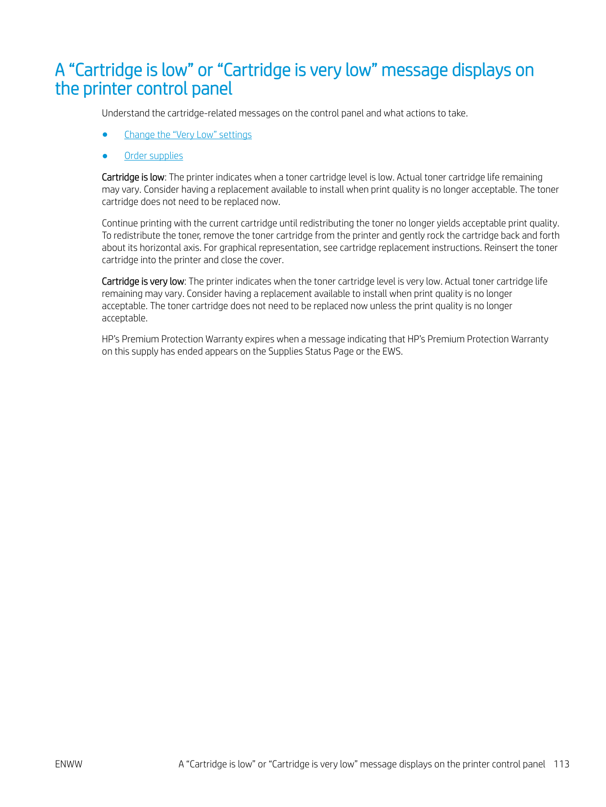 A “Cartridge is low” or “Cartridge is very low” message displays on the printer control panel Understand the cartridge-related messages on the control panel and what actions to take. ● Change the “Very Low” settings ● Order supplies Cartridge is low: The printer indicates when a toner cartridge level is low. Actual toner cartridge life remaining may vary. Consider having a replacement available to install when print quality is no longer acceptable. The toner cartridge does not need to be replaced now. Continue printing with the current cartridge until redistributing the toner no longer yields acceptable print quality. To redistribute the toner, remove the toner cartridge from the printer and gently rock the cartridge back and forth about its horizontal axis. For graphical representation, see cartridge replacement instructions. Reinsert the toner cartridge into the printer and close the cover. Cartridge is very low: The printer indicates when the toner cartridge level is very low. Actual toner cartridge life remaining may vary. Consider having a replacement available to install when print quality is no longer acceptable. The toner cartridge does not need to be replaced now unless the print quality is no longer acceptable. HP’s Premium Protection Warranty expires when a message indicating that HP’s Premium Protection Warranty on this supply has ended appears on the Supplies Status Page or the EWS.