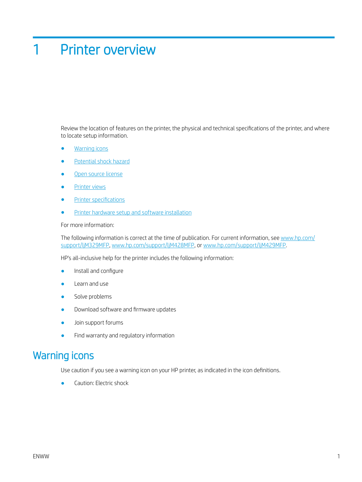 1 Printer overview Review the location of features on the printer, the physical and technical specifications of the printer, and where to locate setup information. ● Warning icons ● Potential shock hazard ● Open source license ● Printer views ● Printer specificationsspecifications ● Printer hardware setup and software installation For more information: The following information is correct at the time of publication. For current information, see www.hp.com/ support/ljM329MFP, www.hp.com/support/ljM428MFP, or www.hp.com/support/ljM429MFP. HP's all-inclusive help for the printer includes the following information: ● Install and configure ● Learn and use ● Solve problems ● Download software and firmware updates ● Join support forums ● Find warranty and regulatory information Warning icons Use caution if you see a warning icon on your HP printer, as indicated in the icon definitions. ● Caution: Electric shock