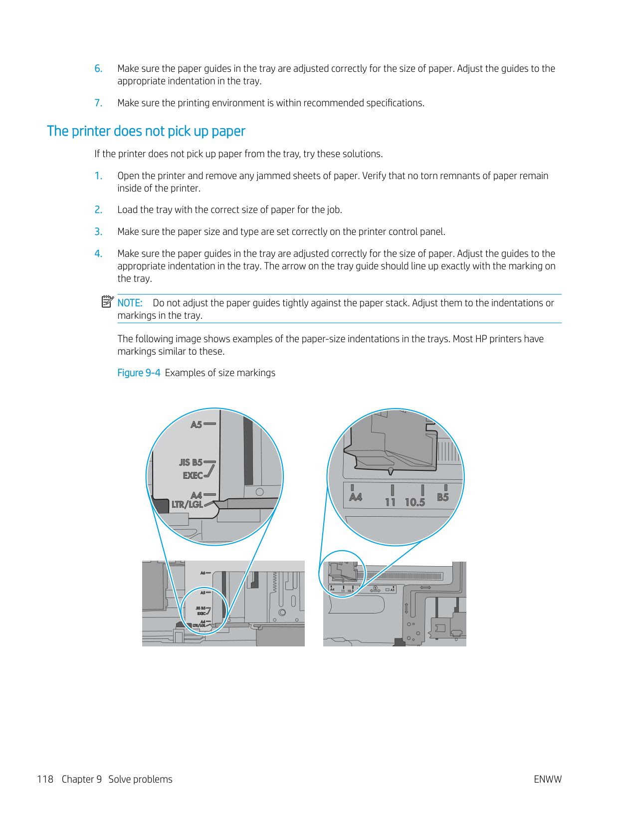 Do not adjust the paper guides tightly against the paper stack. Adjust them to the indentations or markings in the tray. The following image shows examples of the paper-size indentations in the trays. Most HP printers have markings similar to these. Figure 9-4 Examples of size markings 118 Chapter 9 Solve problemsEnww