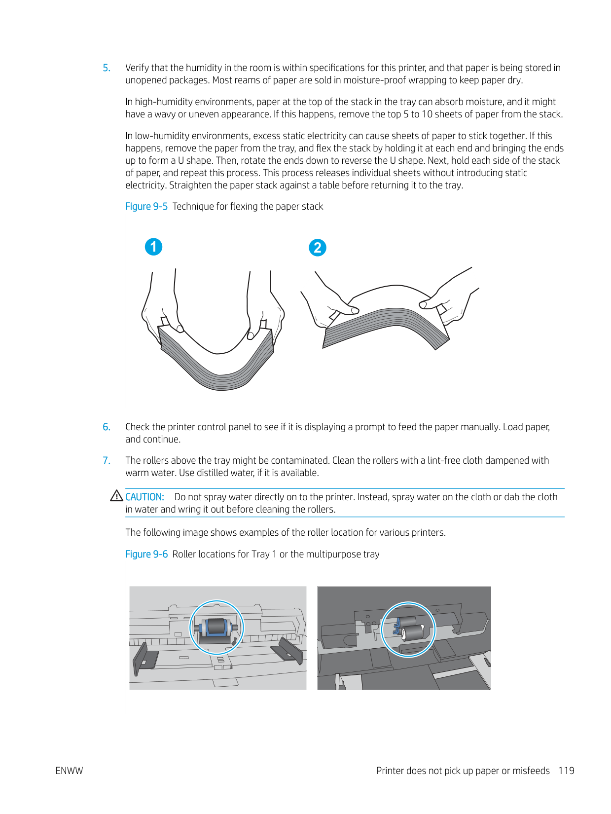 Fanning the paper introduces static electricity. Instead of fanning the paper, flex the stack by holding it at each end and bringing the ends up to form a U shape. Then, rotate the ends down to reverse the U shape. Next, hold each side of the stack of paper, and repeat this process. This process releases individual sheets without introducing static electricity. Straighten the paper stack against a table before returning it to the tray. Figure 9-1 Technique for flexing the paper stack 1 2Enww