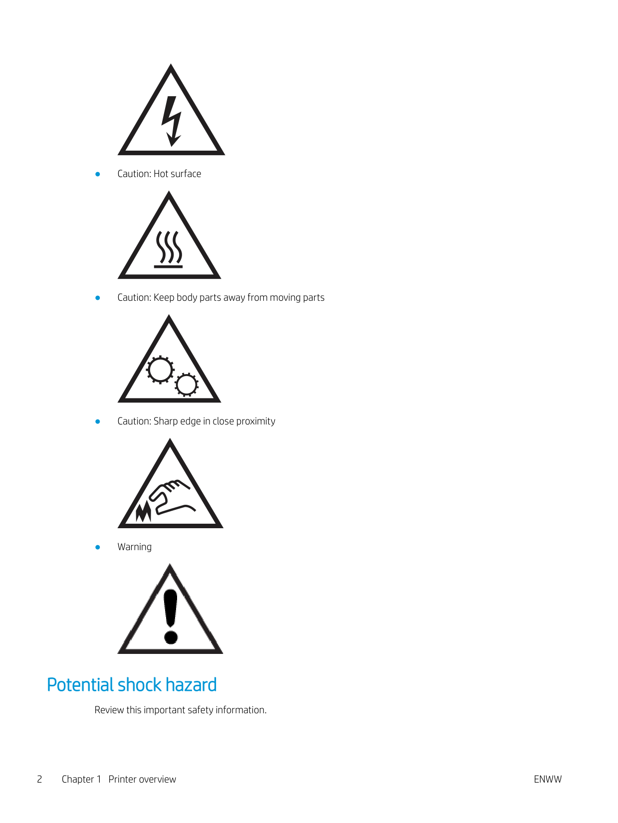 1● Caution: Hot surface ● Caution: Keep body parts away from moving parts ● Caution: Sharp edge in close proximity ● Warning Potential shock hazard Review this important safety information. 2 Chapter 1 Printer overview