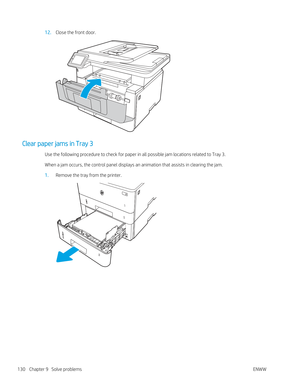 Clear paper jams 125Clear paper jams in Tray 2 Use the following procedure to check for paper in all possible jam locations related to Tray 2. When a jam occurs, the control panel displays an animation that assists in clearing the jam.