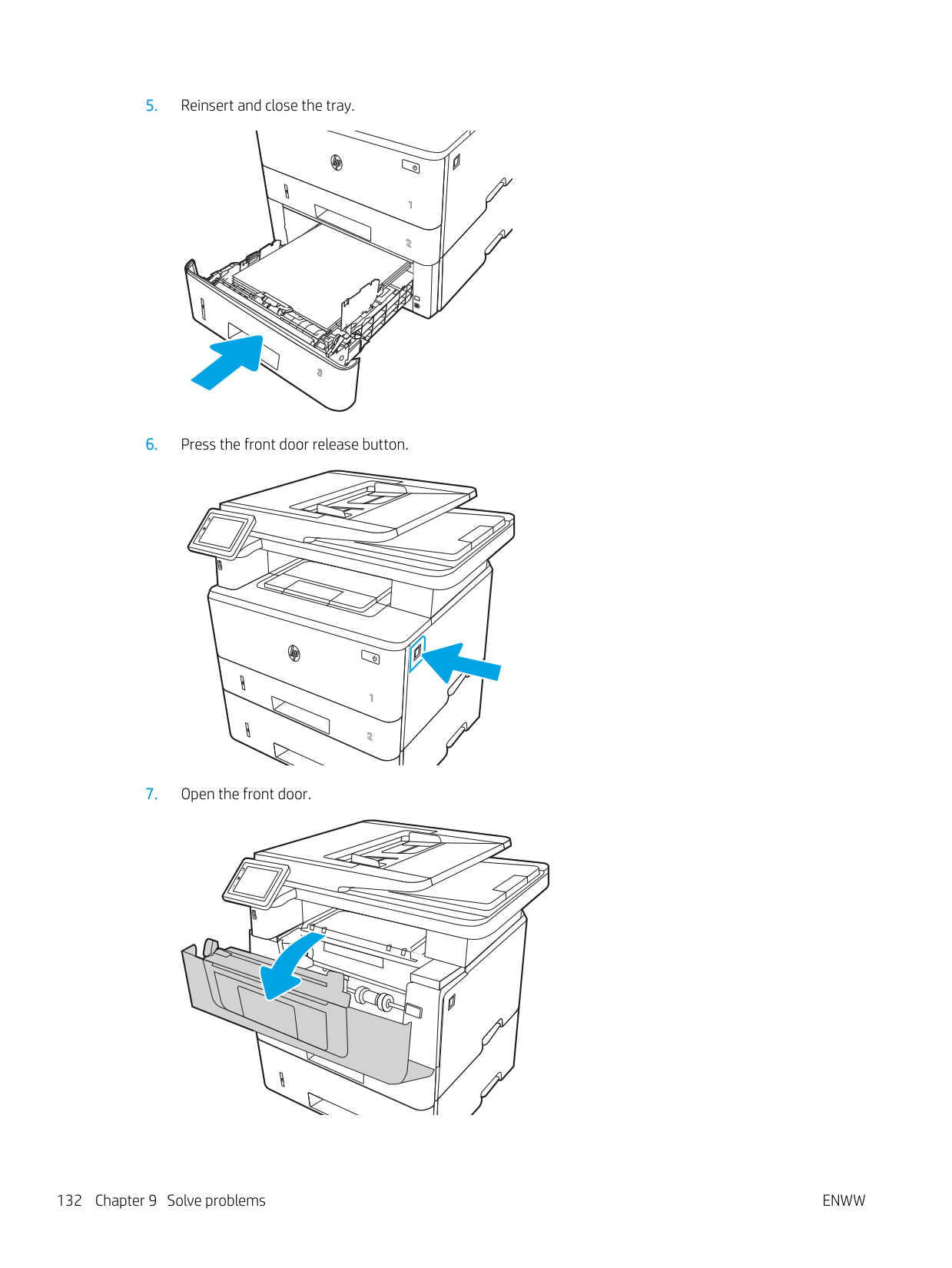 Do not extend more than one paper tray at a time. Do not use paper tray as a step. Keep hands out of paper trays when closing. All trays must be closed when moving the printer.Enww