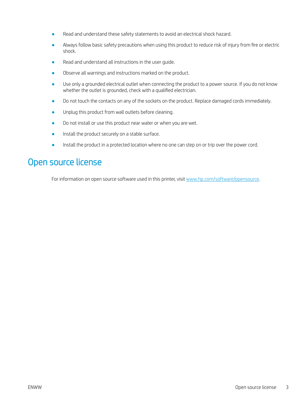 ● Read and understand these safety statements to avoid an electrical shock hazard. ● Always follow basic safety precautions when using this product to reduce risk of injury from fire or electric shock. ● Read and understand all instructions in the user guide. ● Observe all warnings and instructions marked on the product. ● Use only a grounded electrical outlet when connecting the product to a power source. If you do not know whether the outlet is grounded, check with a qualified electrician. ● Do not touch the contacts on any of the sockets on the product. Replace damaged cords immediately. ● Unplug this product from wall outlets before cleaning. ● Do not install or use this product near water or when you are wet. ● Install the product securely on a stable surface. ● Install the product in a protected location where no one can step on or trip over the power cord. Open source license For information on open source software used in this printer, visit www.hp.com/software/opensource.