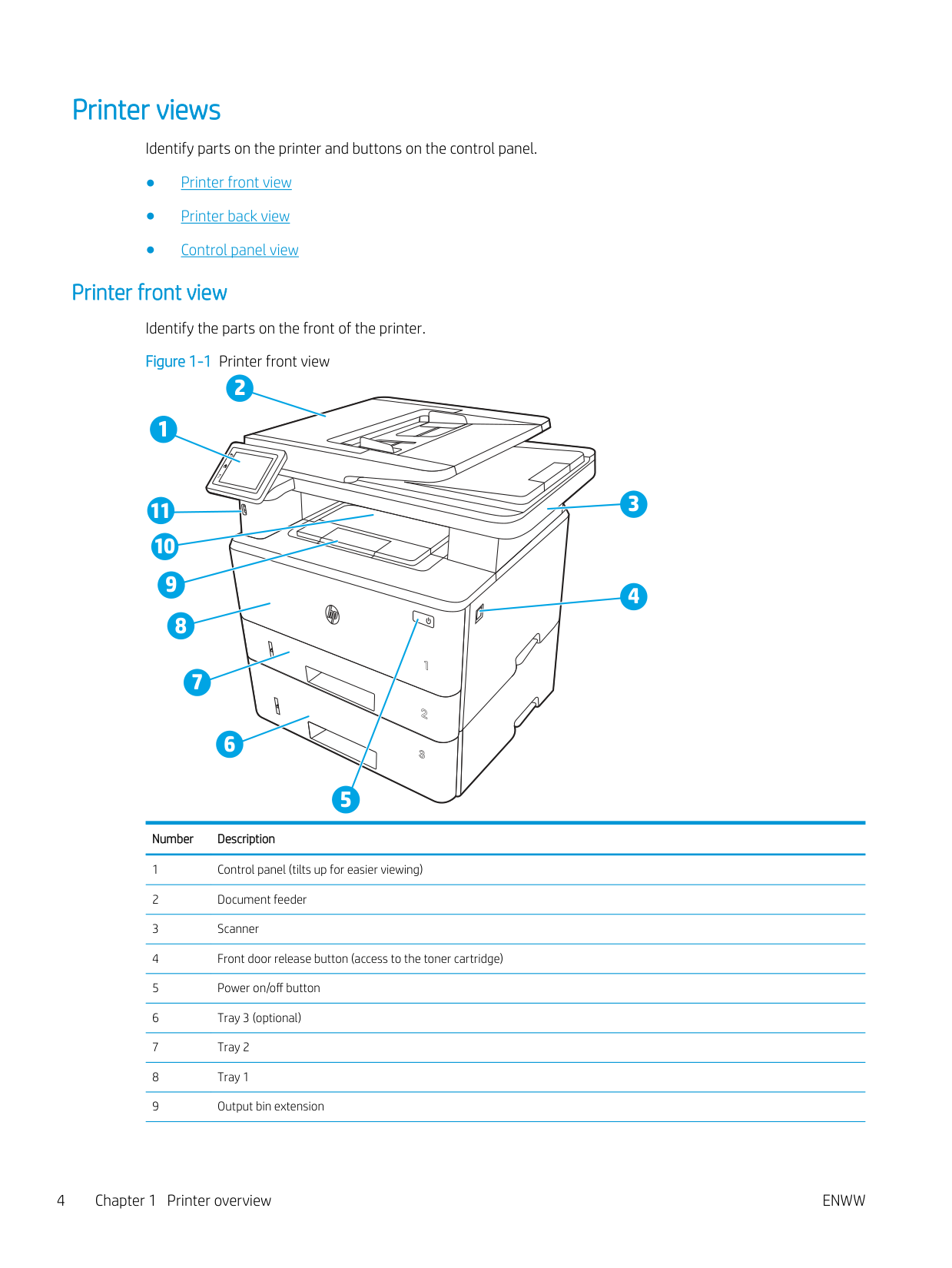 Open source license 3Printer views Identify parts on the printer and buttons on the control panel. ● Printer front view ● Printer back view ● Control panel view Printer front view Identify the parts on the front of the printer. Figure 1-1 Printer front view 3 6 7 8 1 2 11 10 9 4 3 5 2 1 Number Description 1 Control panel (tilts up for easier viewing) 2 Document feeder 3 Scanner 4 Front door release button (access to the toner cartridge) 5 Power on/off button 6 Tray 3 (optional) 7 Tray 2 8 Tray 1 9 Output bin extension 4 Chapter 1 Printer overview