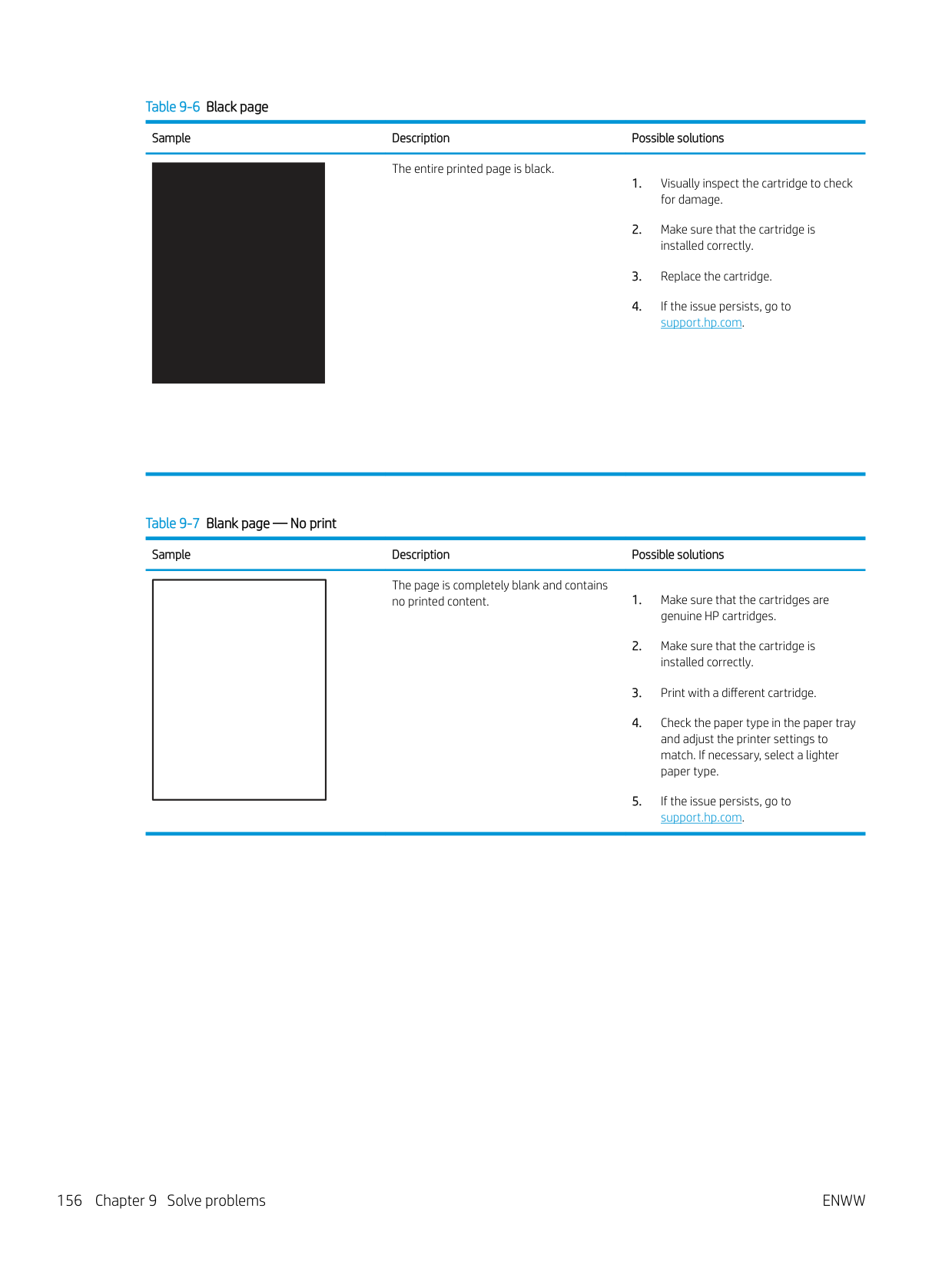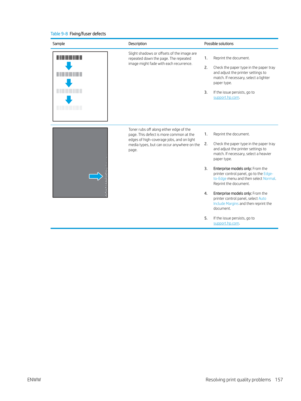 Resolving print quality problems 153Table 9-4 Image defects table quick reference Sample Description Possible solutions Table 9-11 Light print on page 159 Table 9-9 Gray background or dark print on page 158 Table 9-7 Blank page — No print on page 156 Table 9-6 Black page on page 156 Table 9-5 Banding defects on page 155 Table 9-13 Streak defects on page 161 Table 9-8 Fixing/fuser defects on page 157 Table 9-10 Image placement defects on page 158 Table 9-12 Output defects on page 160 154 Chapter 9 Solve problems