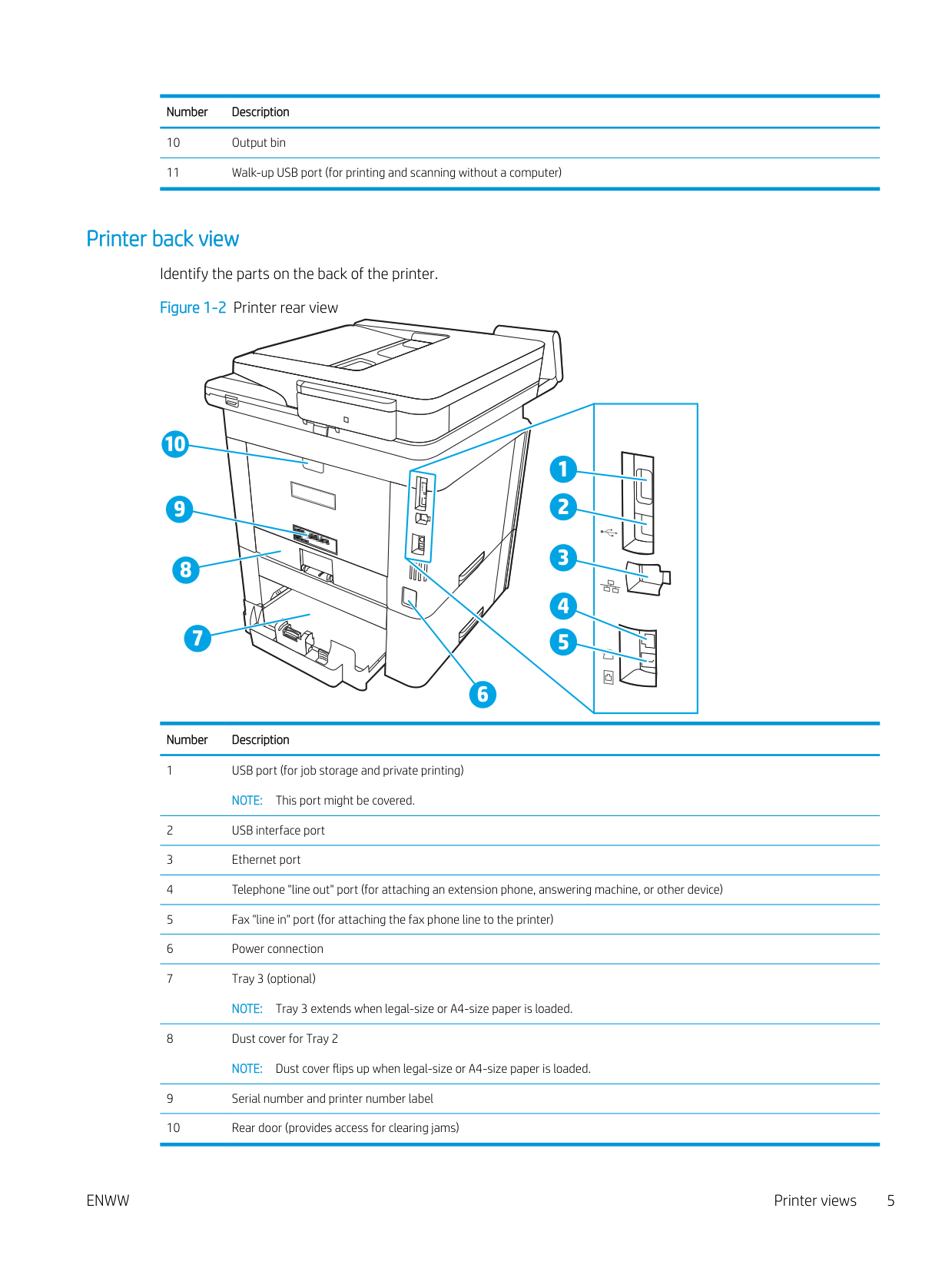 Number Description 10 Output bin 11 Walk-up USB port (for printing and scanning without a computer) Printer back view Identify the parts on the back of the printer. Figure 1-2 Printer rear view 10 7 6 1 2 3 5 4 8 9 Number Description 1 USB port (for job storage and private printing)