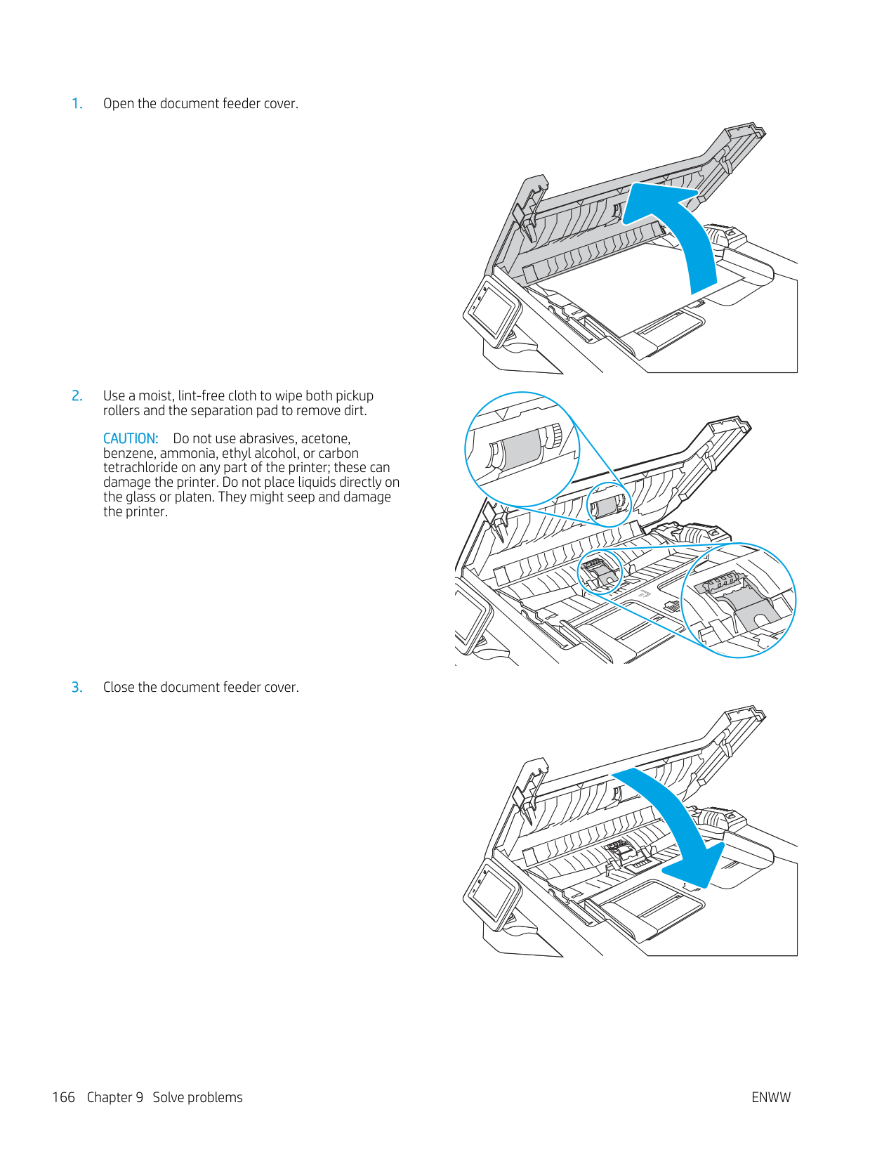 Do not use abrasives, acetone, benzene, ammonia, ethyl alcohol, or carbon tetrachloride on any part of the printer; these can damage the printer. Do not place liquids directly on the glass or platen. They might seep and damage the printer.166 Chapter 9 Solve problems