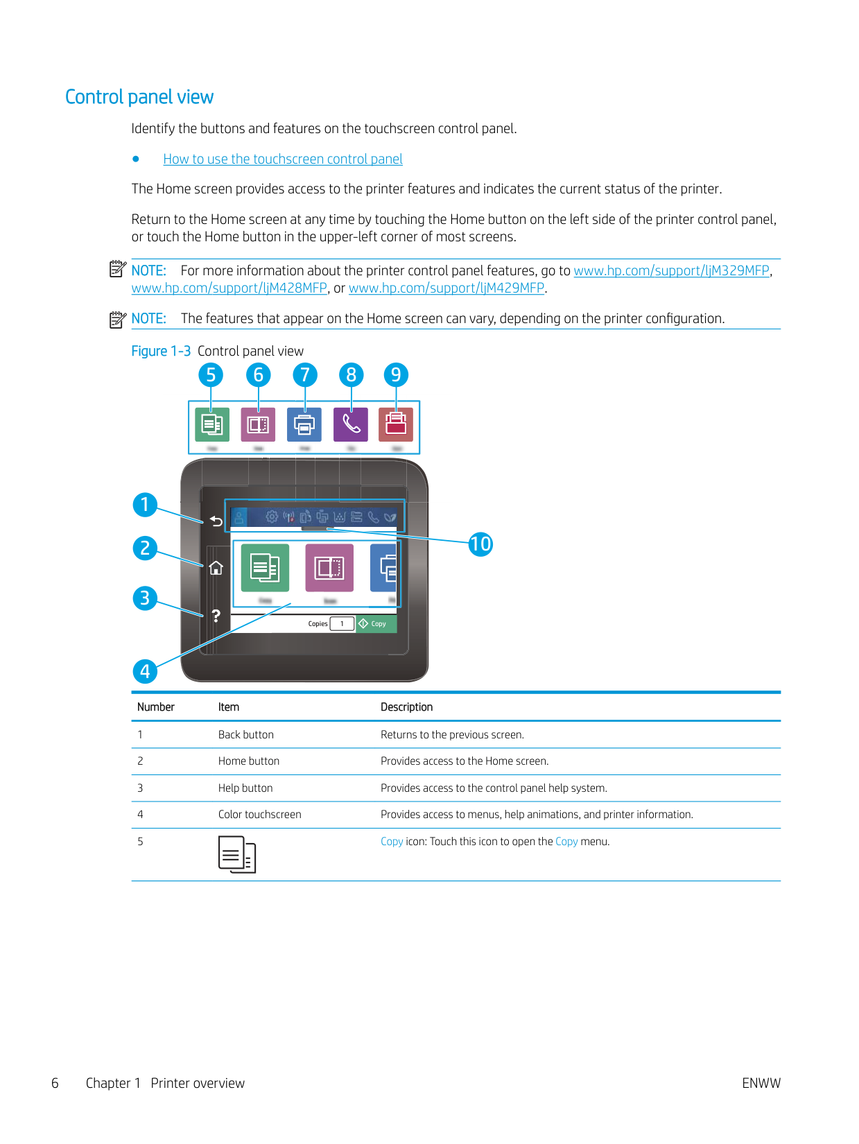The features that appear on the Home screen can vary, depending on the printer configuration. Figure 1-3 Control panel view Copy Copies 1 1 2 3 5 6 7 8 9 10 4 Number Item Description 1 Back button Returns to the previous screen. 2 Home button Provides access to the Home screen. 3 Help button Provides access to the control panel help system. 4 Color touchscreen Provides access to menus, help animations, and printer information. 5 Copy icon: Touch this icon to open the Copy menu. 6 Chapter 1 Printer overviewEnww