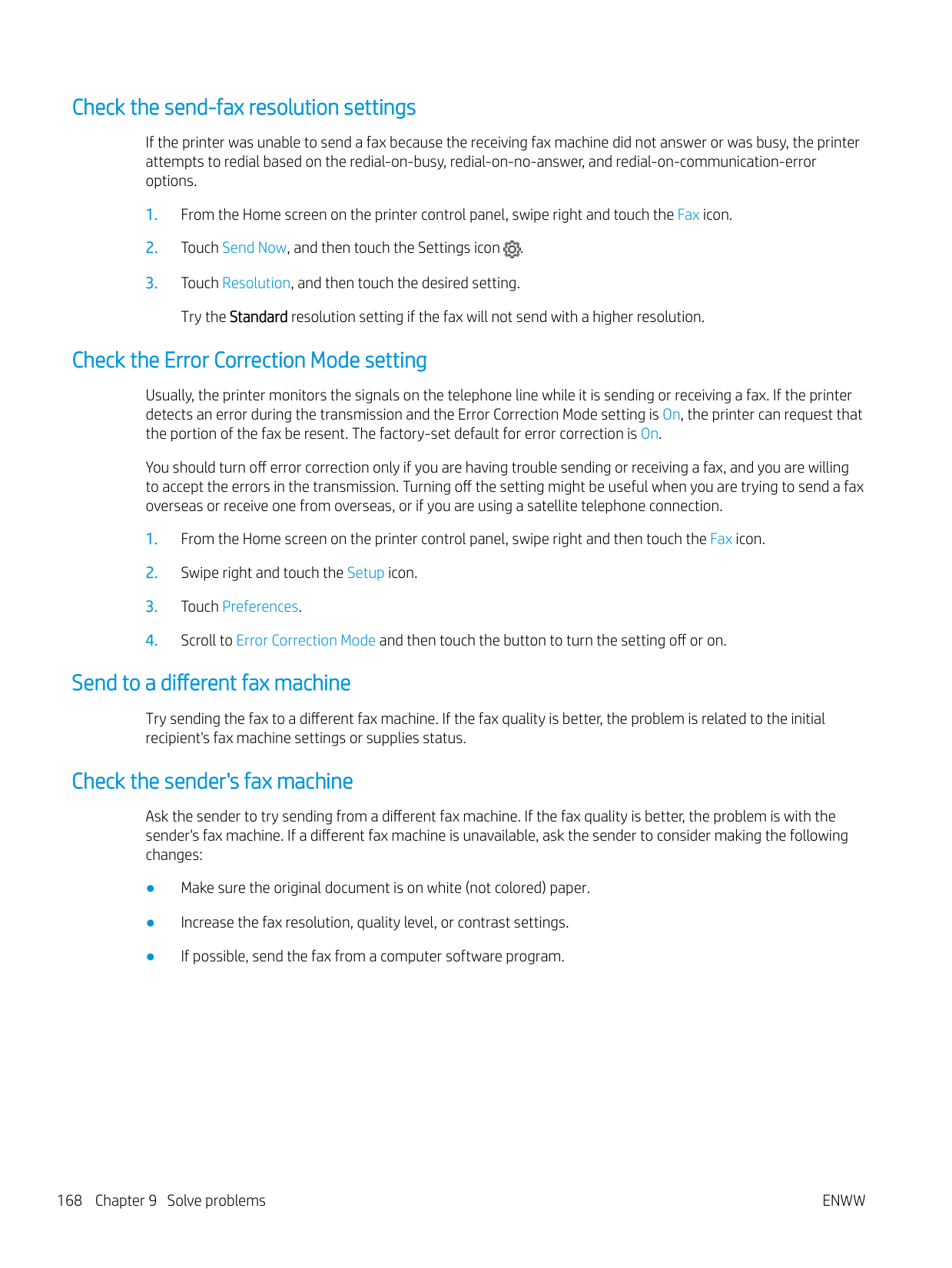 Improve fax image quality Review the following information to improve fax image quality. ● Introduction ● Check the scanner glass for dirt and smudges ● Check the send-fax resolution settings ● Check the Error Correction Mode setting ● Send to a differentdifferent fax machine ● Check the sender's fax machine Introduction If the printer is having image quality problems, try the following solutions in the order presented to resolve the issue. Try these few simple steps first: ● Use the flatbed scanner rather than the document feeder. ● Use high-quality originals. ● When using the document feeder, load the original document into the feeder correctly, using the paper guides, to avoid unclear or skewed images. If the problem still exists, try these additional solutions. If they do not fix the problem, see "Improve print quality" for further solutions. Check the scanner glass for dirt and smudges Over time, specks of debris might collect on the scanner glass and white plastic backing, which can affect performance. Use the following procedure to clean the scanner.