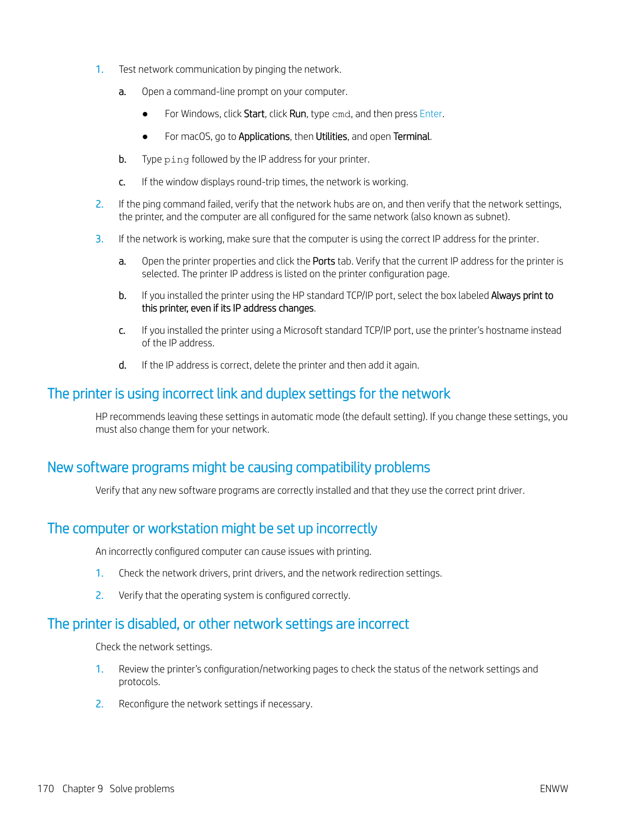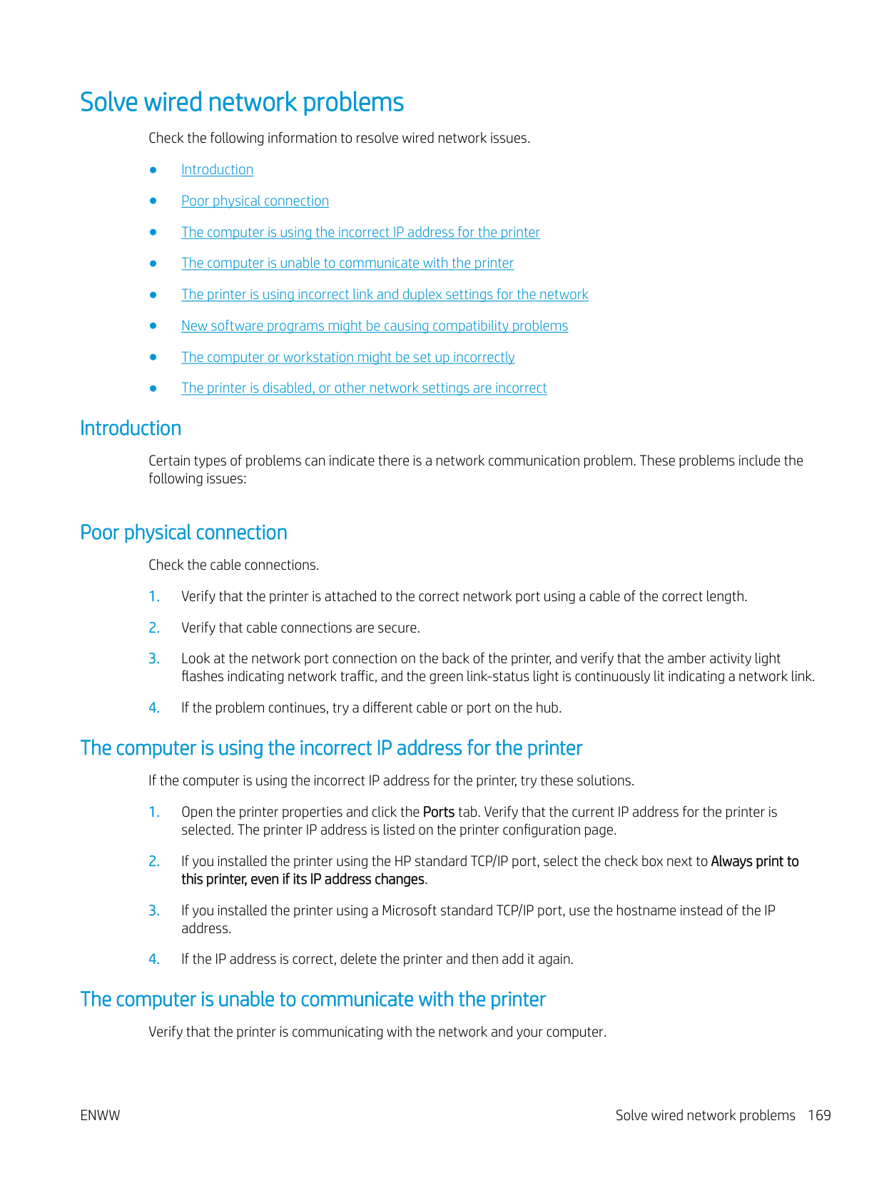 Solve wired network problems Check the following information to resolve wired network issues. ● Introduction ● Poor physical connection ● The computer is using the incorrect IP address for the printer ● The computer is unable to communicate with the printer ● The printer is using incorrect link and duplex settings for the network ● New software programs might be causing compatibility problems ● The computer or workstation might be set up incorrectly ● The printer is disabled, or other network settings are incorrect Introduction Certain types of problems can indicate there is a network communication problem. These problems include the following issues: Poor physical connection Check the cable connections.