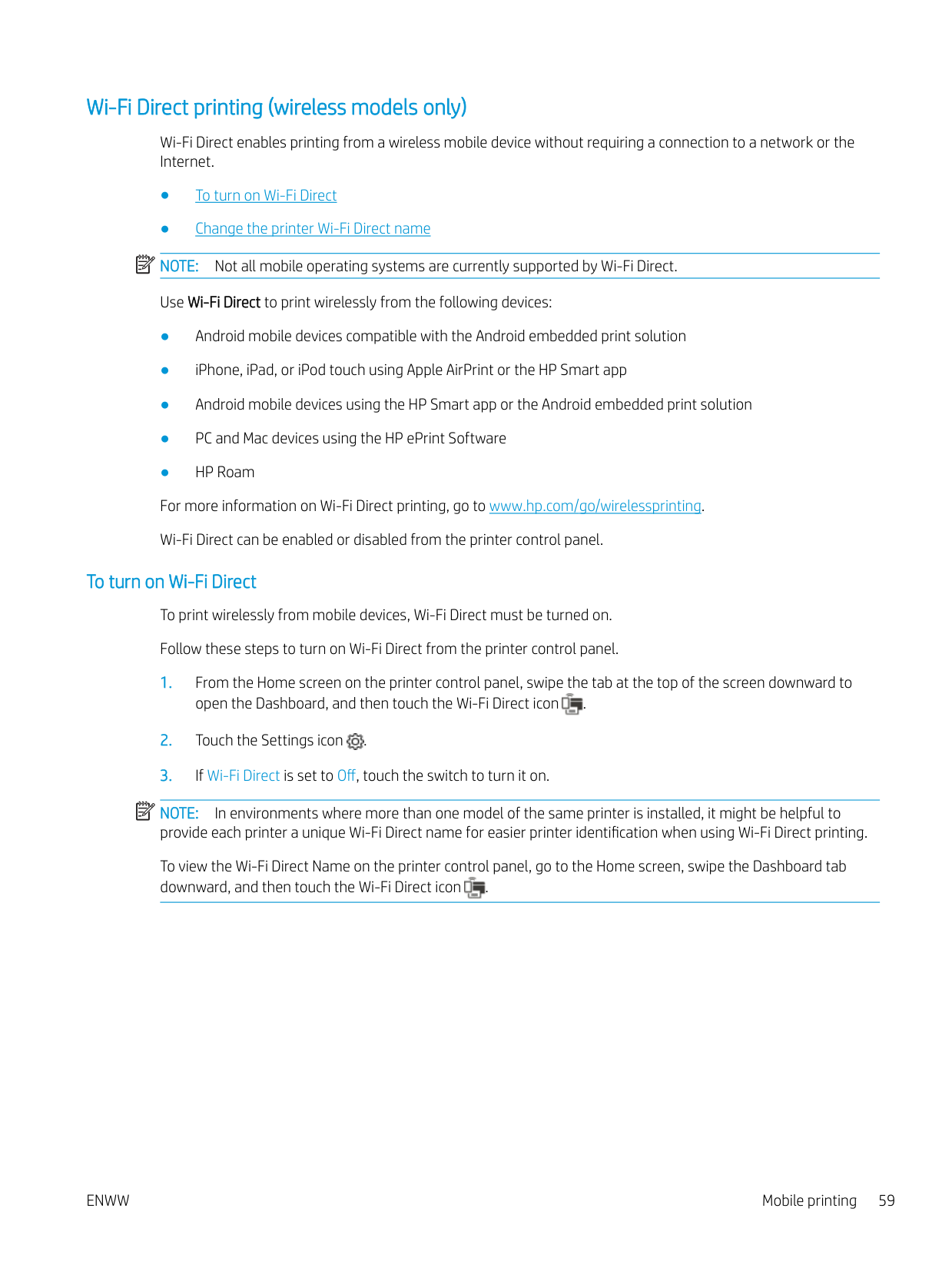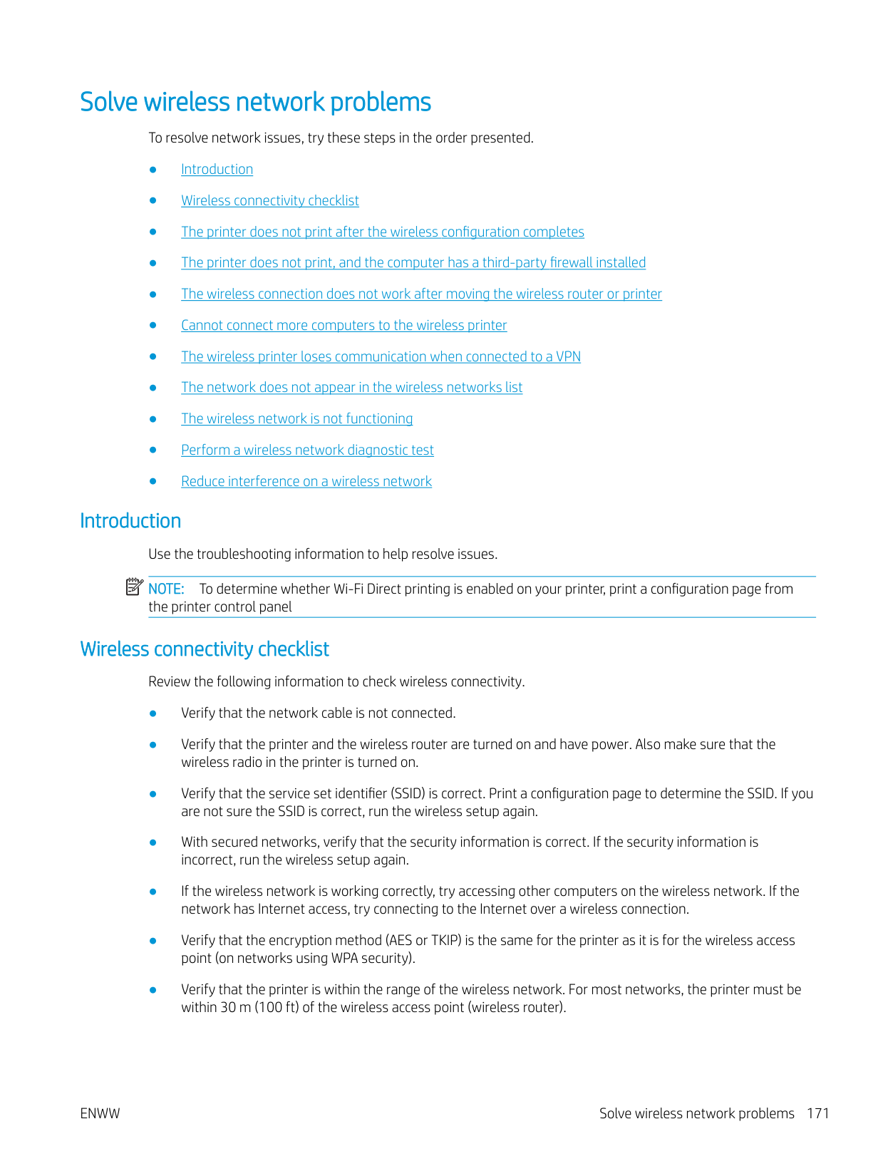 To determine whether Wi-Fi Direct printing is enabled on your printer, print a configuration page from the printer control panel Wireless connectivity checklist Review the following information to check wireless connectivity. ● Verify that the network cable is not connected. ● Verify that the printer and the wireless router are turned on and have power. Also make sure that the wireless radio in the printer is turned on. ● Verify that the service set identifier (SSID) is correct. Print a configuration page to determine the SSID. If you are not sure the SSID is correct, run the wireless setup again. ● With secured networks, verify that the security information is correct. If the security information is incorrect, run the wireless setup again. ● If the wireless network is working correctly, try accessing other computers on the wireless network. If the network has Internet access, try connecting to the Internet over a wireless connection. ● Verify that the encryption method (AES or TKIP) is the same for the printer as it is for the wireless access point (on networks using WPA security). ● Verify that the printer is within the range of the wireless network. For most networks, the printer must be within 30 m (100 ft) of the wireless access point (wireless router).Enww