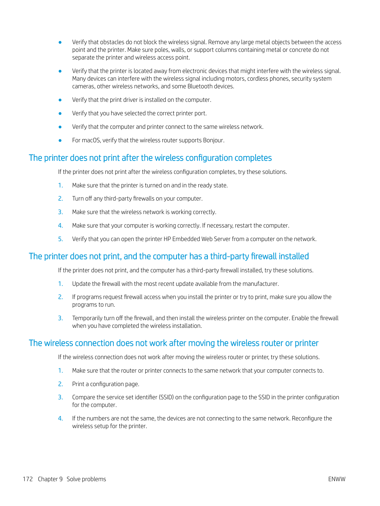 Solve wireless network problems 171● Verify that obstacles do not block the wireless signal. Remove any large metal objects between the access point and the printer. Make sure poles, walls, or support columns containing metal or concrete do not separate the printer and wireless access point. ● Verify that the printer is located away from electronic devices that might interfere with the wireless signal. Many devices can interfere with the wireless signal including motors, cordless phones, security system cameras, other wireless networks, and some Bluetooth devices. ● Verify that the print driver is installed on the computer. ● Verify that you have selected the correct printer port. ● Verify that the computer and printer connect to the same wireless network. ● For macOS, verify that the wireless router supports Bonjour. The printer does not print after the wireless configuration completes If the printer does not print after the wireless configuration completes, try these solutions.