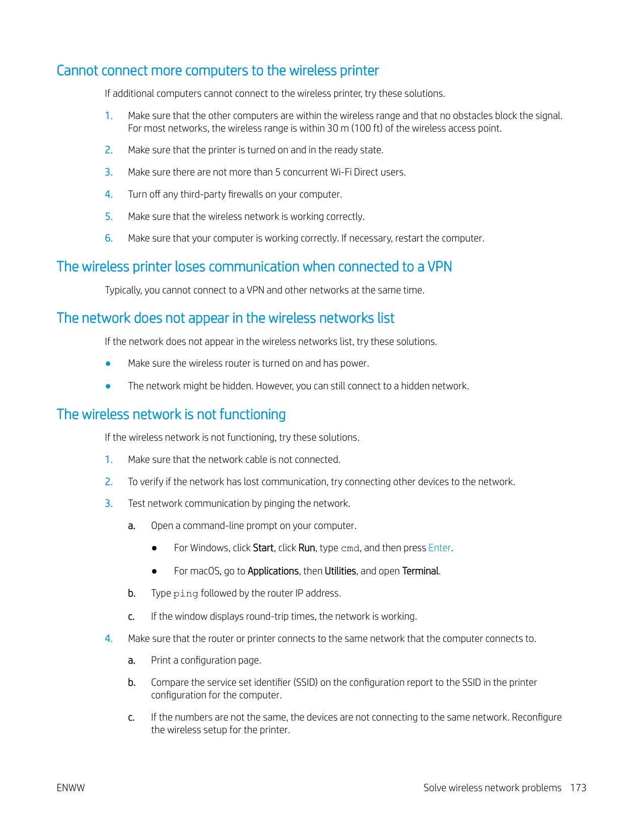 Solve wireless network problems To resolve network issues, try these steps in the order presented. ● Introduction ● Wireless connectivity checklist ● The printer does not print after the wireless configurationconfiguration completes ● The printer does not print, and the computer has a third-party firewallfirewall installed ● The wireless connection does not work after moving the wireless router or printer ● Cannot connect more computers to the wireless printer ● The wireless printer loses communication when connected to a VPN ● The network does not appear in the wireless networks list ● The wireless network is not functioning ● Perform a wireless network diagnostic test ● Reduce interference on a wireless network Introduction Use the troubleshooting information to help resolve issues.