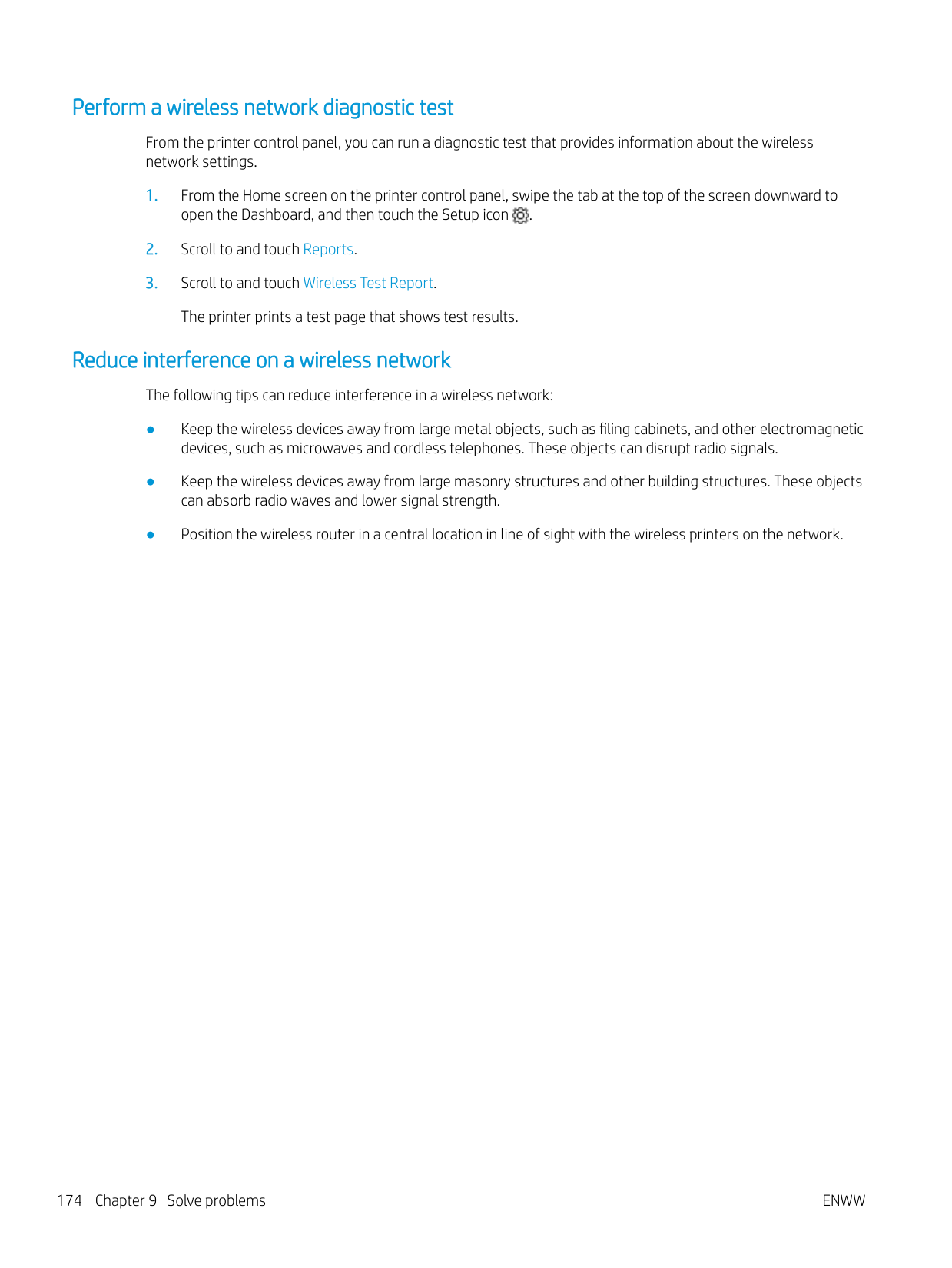 Solve wireless network problems 173Perform a wireless network diagnostic test From the printer control panel, you can run a diagnostic test that provides information about the wireless network settings.