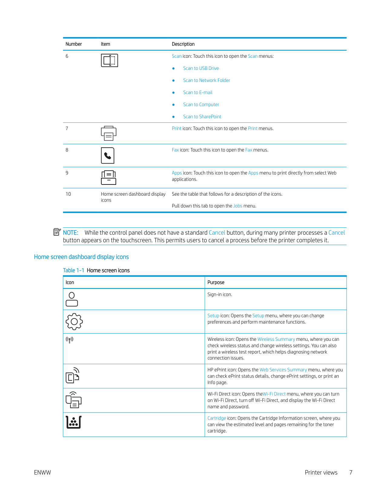 While the control panel does not have a standard Cancel button, during many printer processes a Cancel button appears on the touchscreen. This permits users to cancel a process before the printer completes it. Home screen dashboard display icons Table 1-1 Home screen icons Icon Purpose Sign-in icon. Setup icon: Opens the Setup menu, where you can change preferences and perform maintenance functions. Wireless icon: Opens the Wireless Summary menu, where you can check wireless status and change wireless settings. You can also print a wireless test report, which helps diagnosing network connection issues. HP ePrint icon: Opens the Web Services Summary menu, where you can check ePrint status details, change ePrint settings, or print an Info page. Wi-Fi Direct icon: Opens theWi-Fi Direct menu, where you can turn on Wi-Fi Direct, turn off Wi-Fi Direct, and display the Wi-Fi Direct name and password. Cartridge icon: Opens the Cartridge Information screen, where you can view the estimated level and pages remaining for the toner cartridge.Enww
