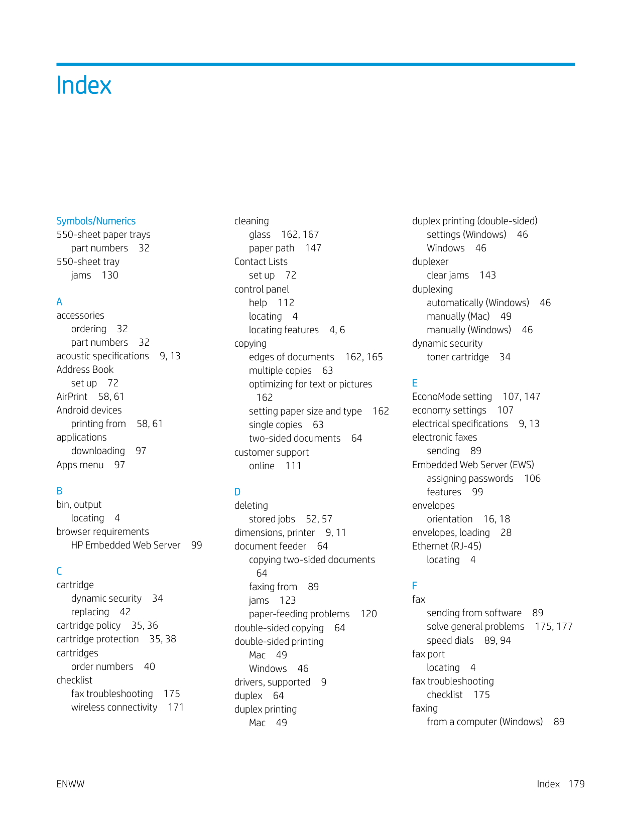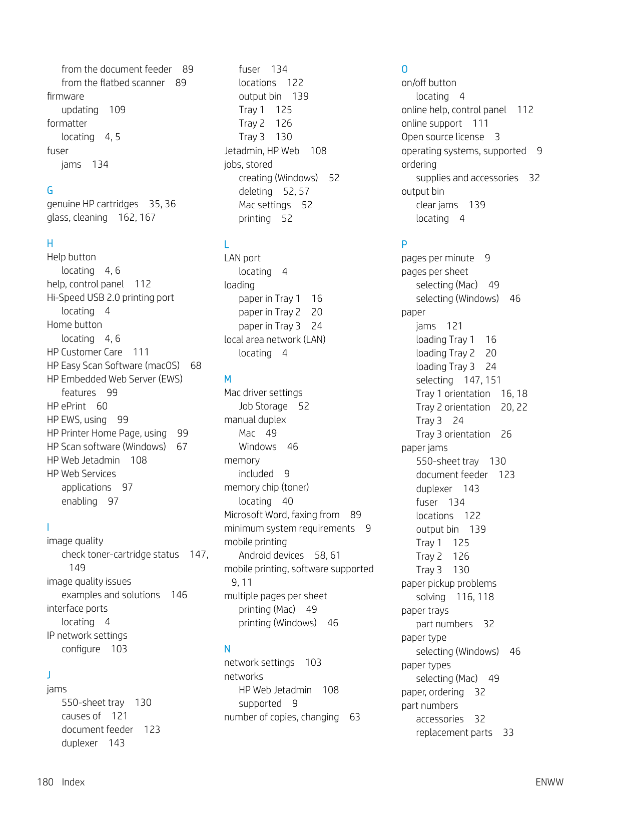 pages per minute 9 pages per sheet selecting (Mac) 49 selecting (Windows) 46 paper jams 121 loading Tray 1 16 loading Tray 2 20 loading Tray 3 24 selecting 147, 151 Tray 1 orientation 16, 18 Tray 2 orientation 20, 22 Tray 3 24 Tray 3 orientation 26 paper jams 550-sheet tray 130 document feeder 123 duplexer 143 fuser 134 locations 122 output bin 139 Tray 1 125 Tray 2 126 Tray 3 130 paper pickup problems solving 116, 118 paper trays part numbers 32 paper type selecting (Windows) 46 paper types selecting (Mac) 49 paper, ordering 32 part numbers accessories 32 replacement parts 33 180 IndexEnww