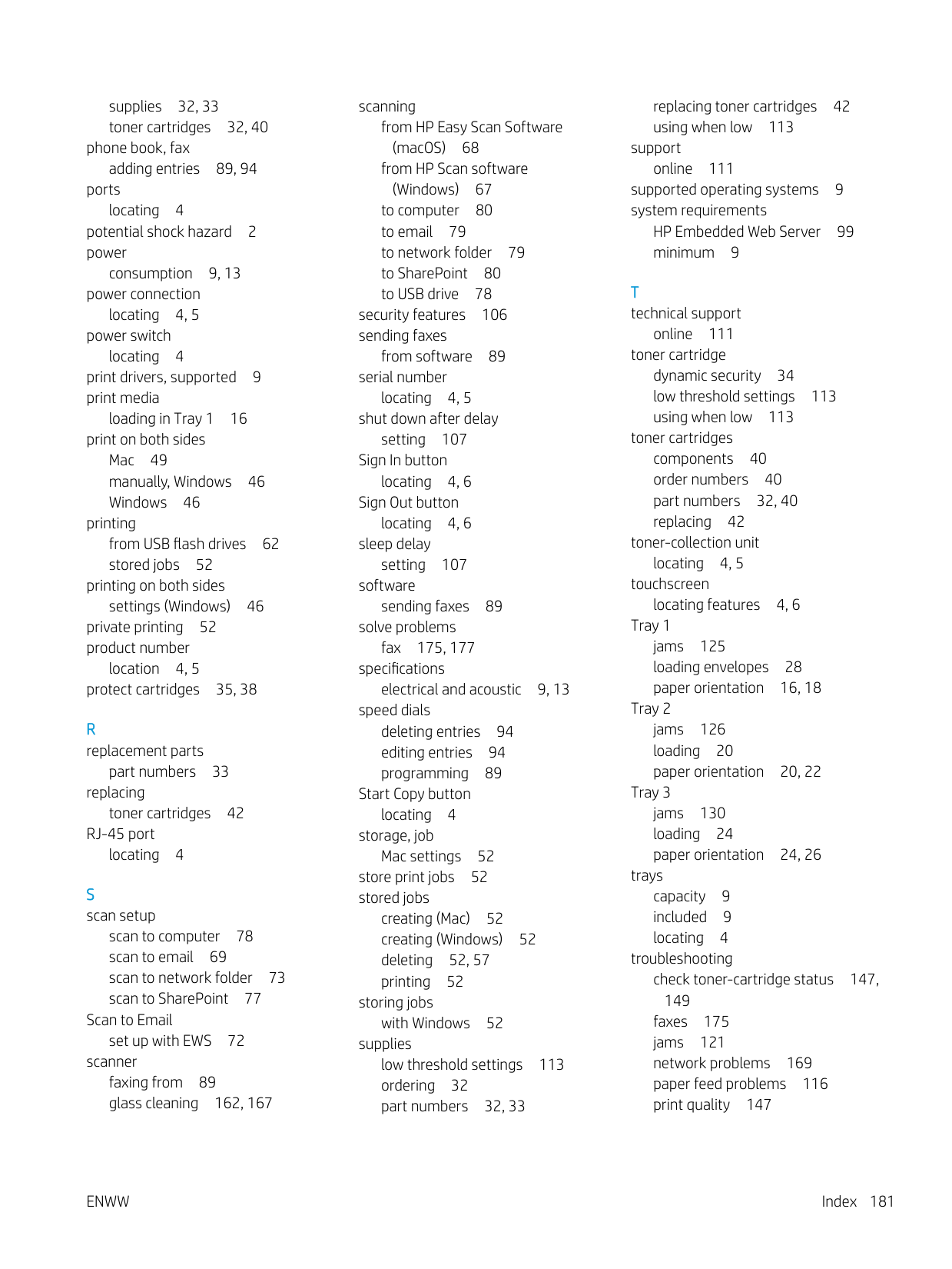 technical support online 111 toner cartridge dynamic security 34 low threshold settings 113 using when low 113 toner cartridges components 40 order numbers 40 part numbers 32, 40 replacing 42 toner-collection unit locating 4, 5 touchscreen locating features 4, 6 Tray 1 jams 125 loading envelopes 28 paper orientation 16, 18 Tray 2 jams 126 loading 20 paper orientation 20, 22 Tray 3 jams 130 loading 24 paper orientation 24, 26 trays capacity 9 included 9 locating 4 troubleshooting check toner-cartridge status 147, 149 faxes 175 jams 121 network problems 169 paper feed problems 116 print quality 147Enww