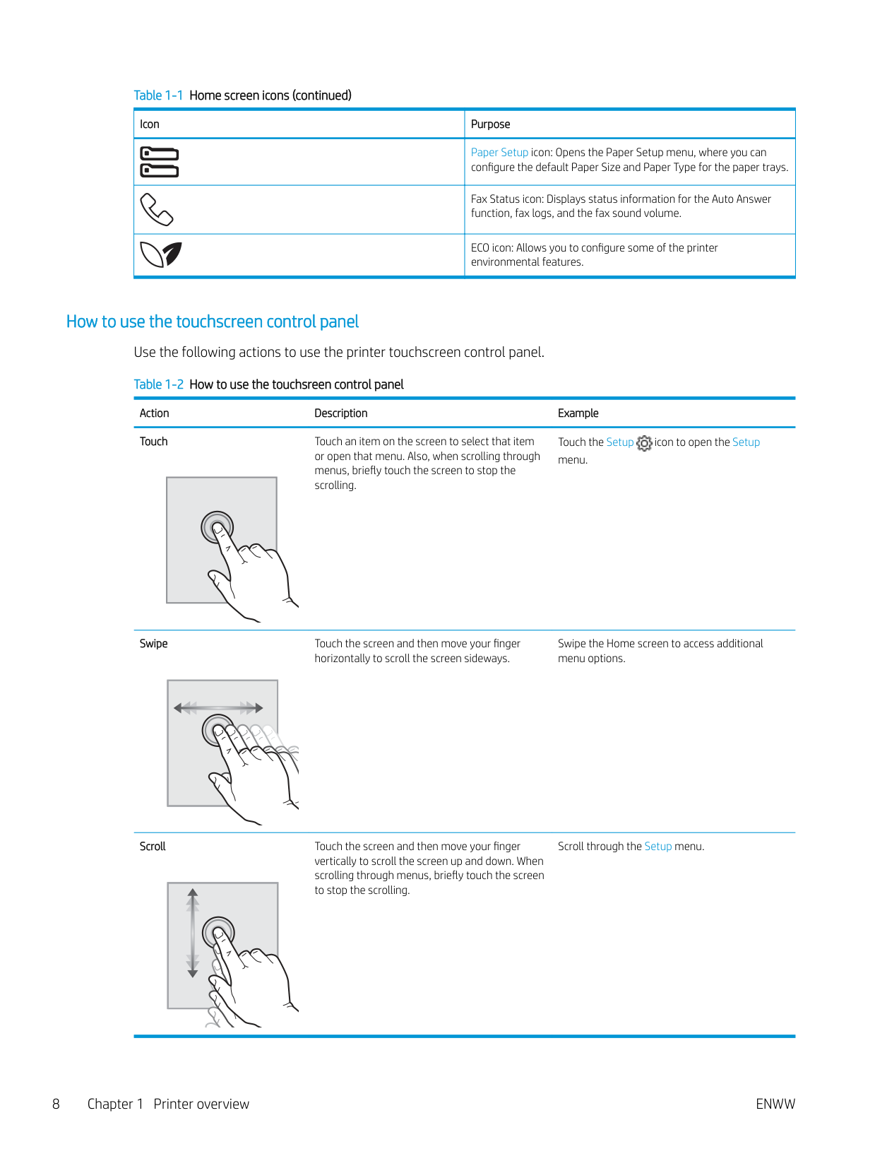 Printer views 7Table 1-1 Home screen icons (continued) Icon Purpose Paper Setup icon: Opens the Paper Setup menu, where you can configure the default Paper Size and Paper Type for the paper trays. Fax Status icon: Displays status information for the Auto Answer function, fax logs, and the fax sound volume. ECO icon: Allows you to configure some of the printer environmental features. How to use the touchscreen control panel Use the following actions to use the printer touchscreen control panel. Table 1-2 How to use the touchsreen control panel Action Description Example Touch Touch an item on the screen to select that item or open that menu. Also, when scrolling through menus, briefly touch the screen to stop the scrolling. Touch the Setup icon to open the Setup menu. Swipe Touch the screen and then move your finger horizontally to scroll the screen sideways. Swipe the Home screen to access additional menu options. Scroll Touch the screen and then move your finger vertically to scroll the screen up and down. When scrolling through menus, briefly touch the screen to stop the scrolling. Scroll through the Setup menu. 8 Chapter 1 Printer overview