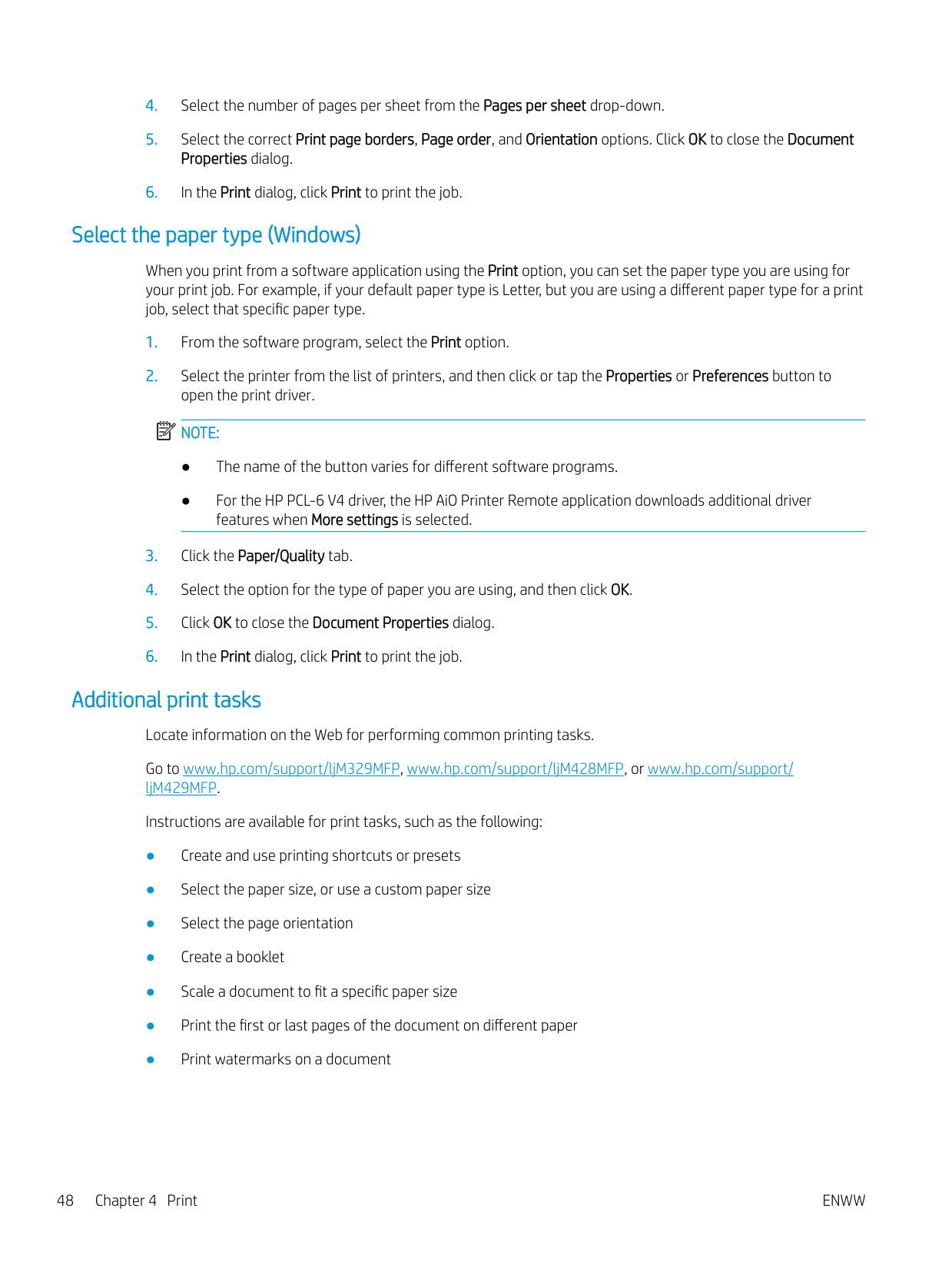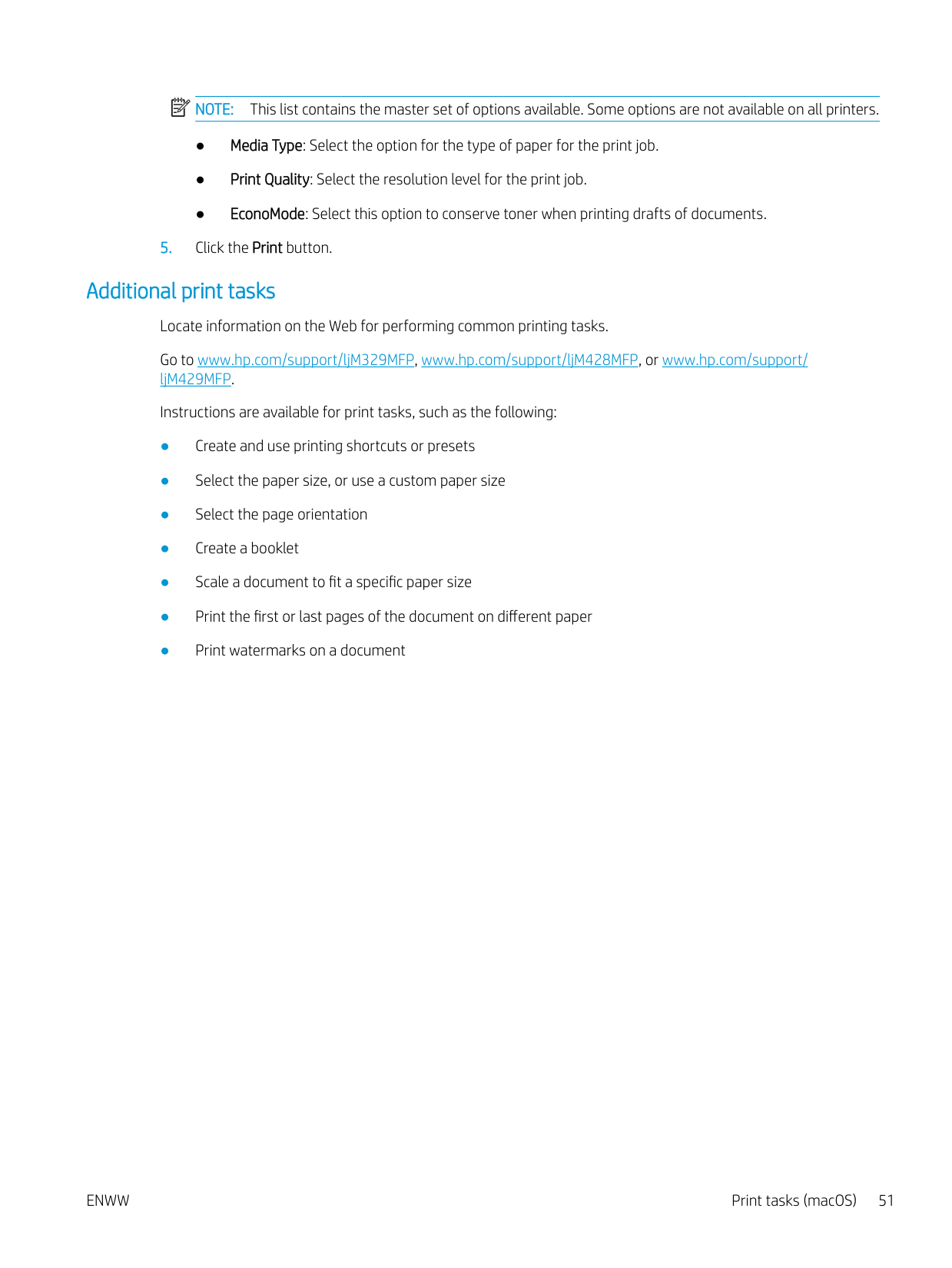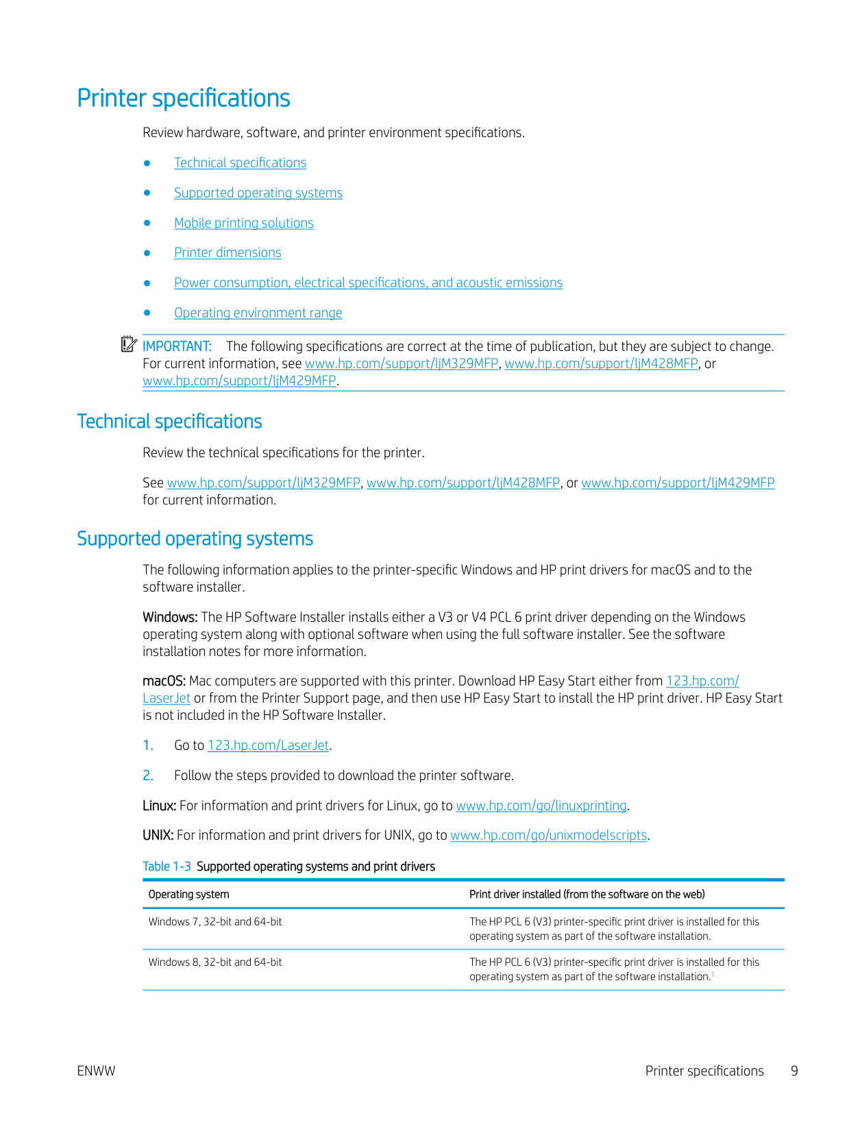 The following specifications are correct at the time of publication, but they are subject to change. For current information, see www.hp.com/support/ljM329MFP, www.hp.com/support/ljM428MFP, or www.hp.com/support/ljM429MFP. Technical specifications Review the technical specifications for the printer. See www.hp.com/support/ljM329MFP, www.hp.com/support/ljM428MFP, or www.hp.com/support/ljM429MFP for current information. Supported operating systems The following information applies to the printer-specific Windows and HP print drivers for macOS and to the software installer. Windows: The HP Software Installer installs either a V3 or V4 PCL 6 print driver depending on the Windows operating system along with optional software when using the full software installer. See the software installation notes for more information. macOS: Mac computers are supported with this printer. Download HP Easy Start either from 123.hp.com/ LaserJet or from the Printer Support page, and then use HP Easy Start to install the HP print driver. HP Easy Start is not included in the HP Software Installer.Enww