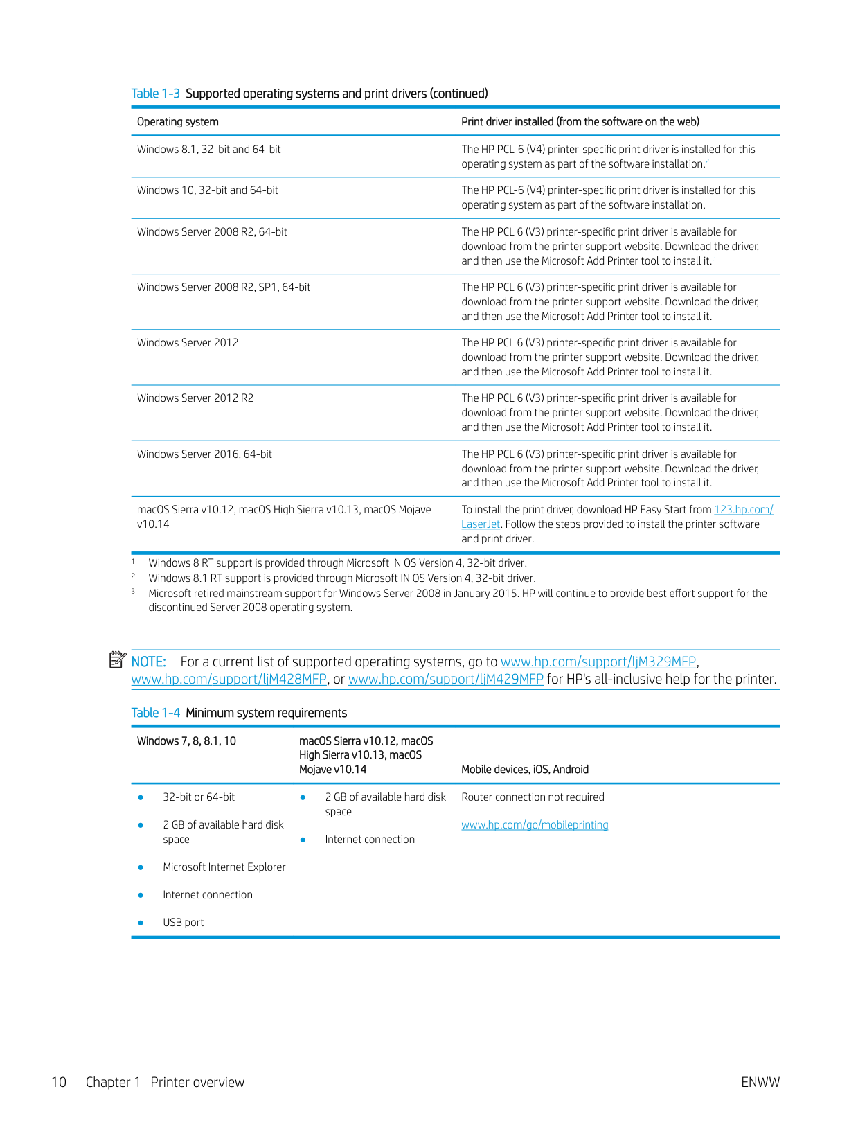 For a current list of supported operating systems, go to www.hp.com/support/ljM329MFP, www.hp.com/support/ljM428MFP, or www.hp.com/support/ljM429MFP for HP's all-inclusive help for the printer. Table 1-4 Minimum system requirements Windows 7, 8, 8.1, 10 macOS Sierra v10.12, macOS High Sierra v10.13, macOS Mojave v10.14 Mobile devices, iOS, Android ● 32-bit or 64-bit ● 2 GB of available hard disk space ● Microsoft Internet Explorer ● Internet connection ● USB port ● 2 GB of available hard disk space ● Internet connection Router connection not required www.hp.com/go/mobileprinting 10 Chapter 1 Printer overviewEnww