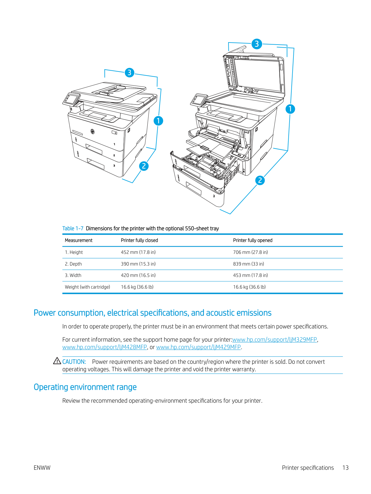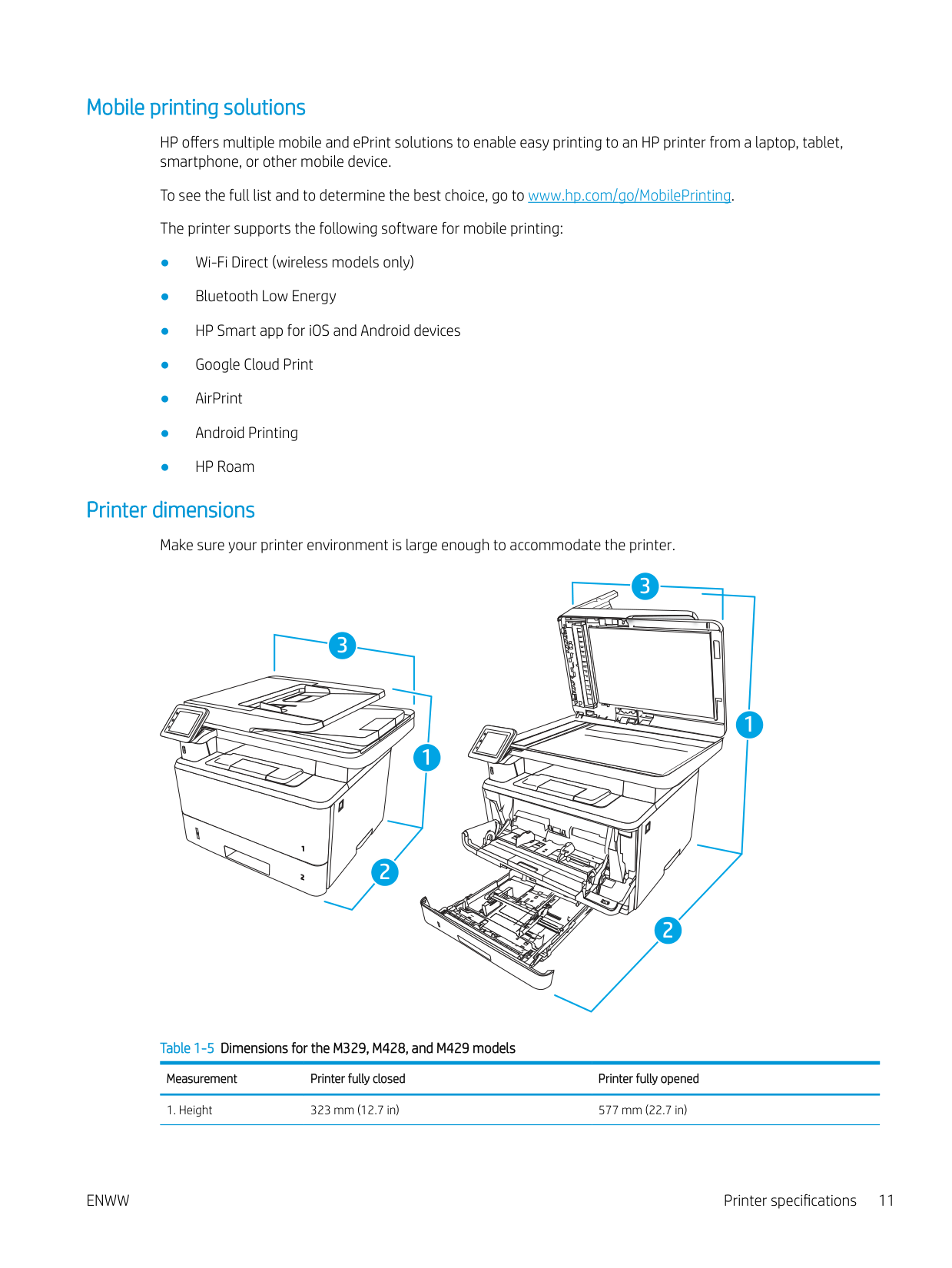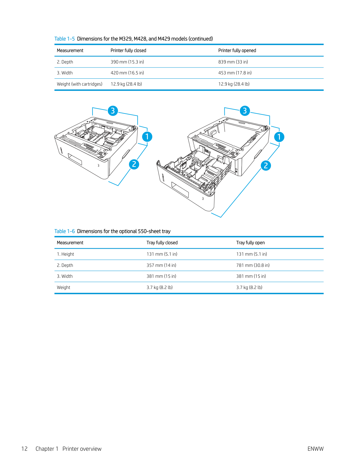 2 2 1 2 3 Table 1-5 Dimensions for the M329, M428, and M429 models Measurement Printer fully closed Printer fully openedEnww