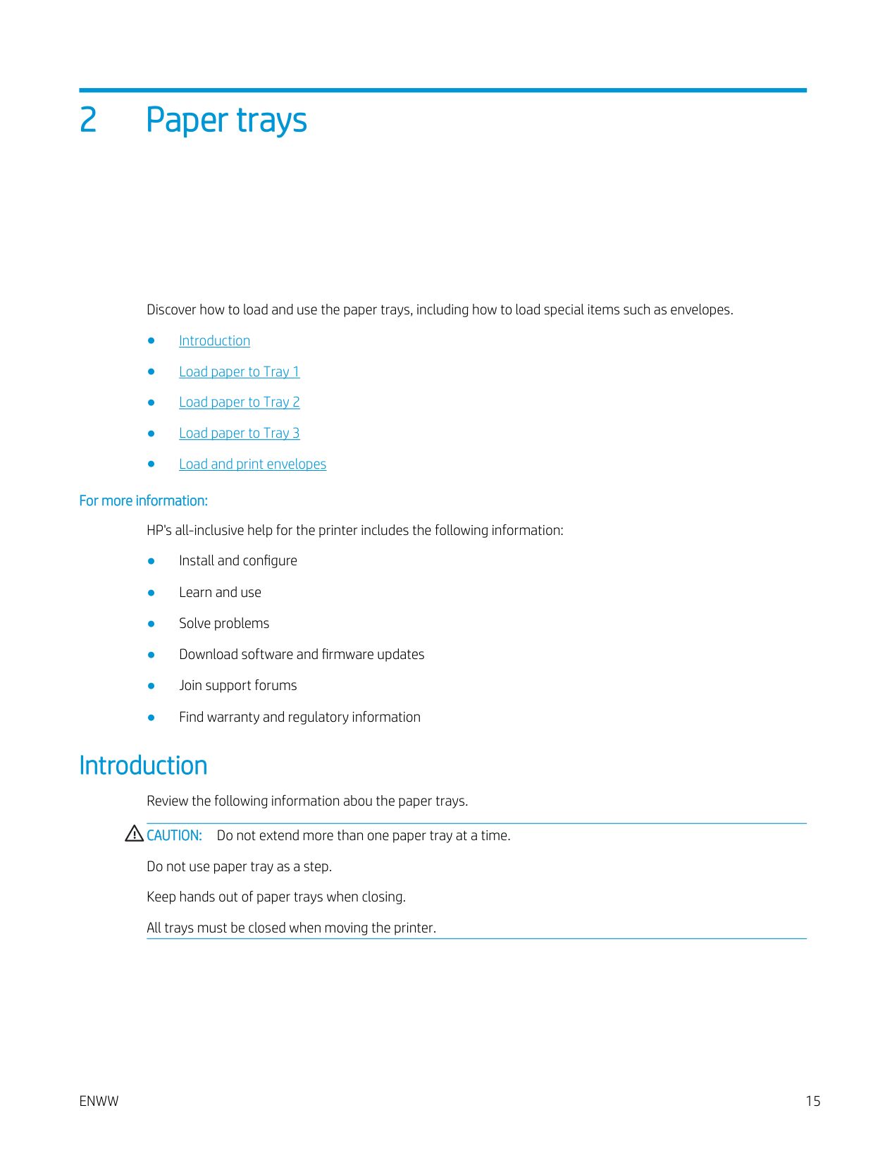 2 Paper trays Discover how to load and use the paper trays, including how to load special items such as envelopes. ● Introduction ● Load paper to Tray 1 ● Load paper to Tray 2 ● Load paper to Tray 3 ● Load and print envelopes For more information: HP's all-inclusive help for the printer includes the following information: ● Install and configure ● Learn and use ● Solve problems ● Download software and firmware updates ● Join support forums ● Find warranty and regulatory information Introduction Review the following information abou the paper trays.