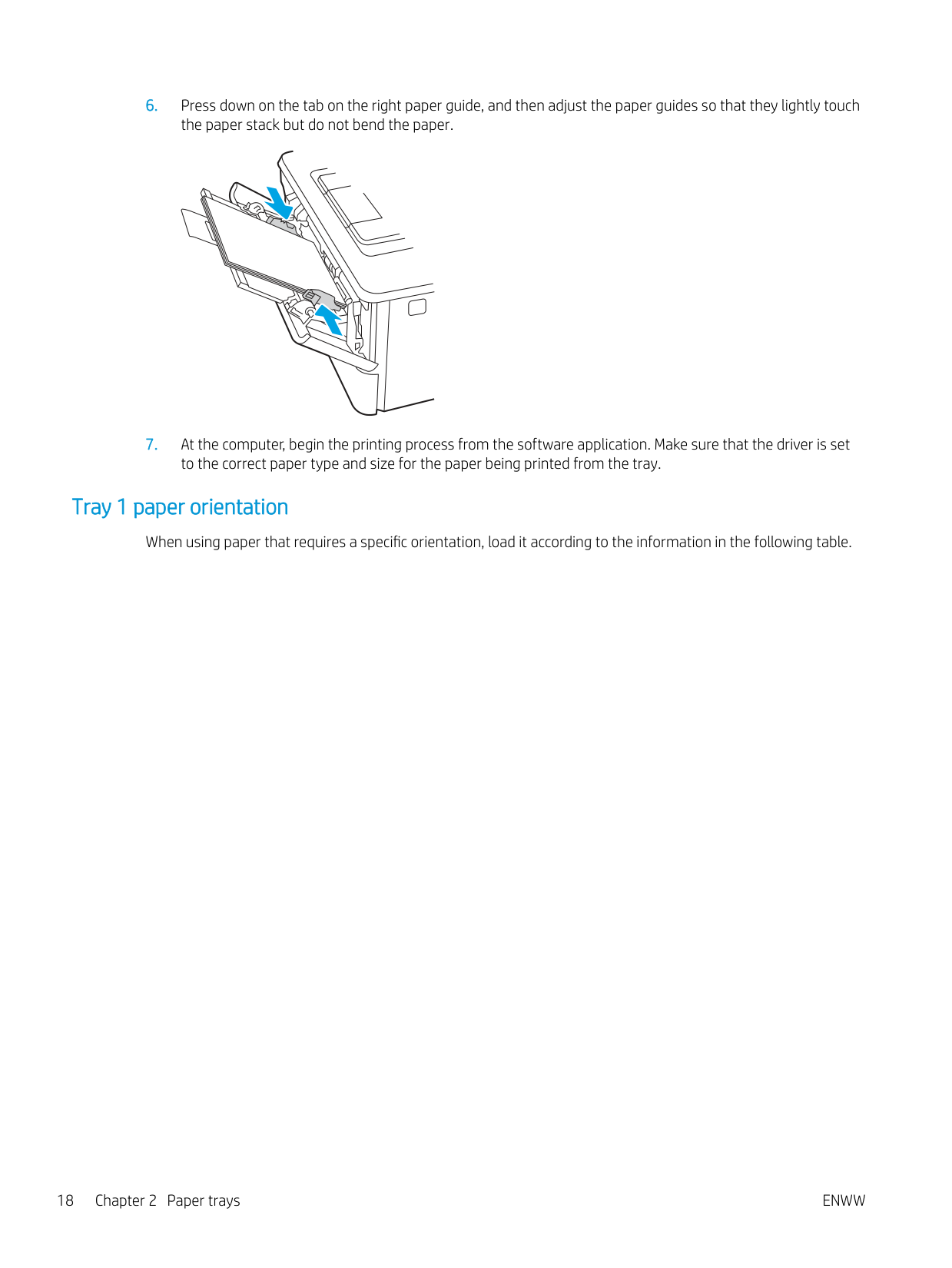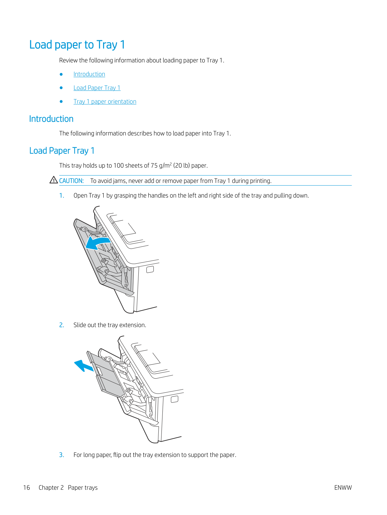 15Load paper to Tray 1 Review the following information about loading paper to Tray 1. ● Introduction ● Load Paper Tray 1 ● Tray 1 paper orientation Introduction The following information describes how to load paper into Tray 1. Load Paper Tray 1 This tray holds up to 100 sheets of 75 g/m2 (20 lb) paper.